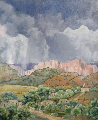 Agnes Tait (1894-1981). "Tesuque-New Mexico". 23" x 19". Oil on Board. (est $5,000-7,000).