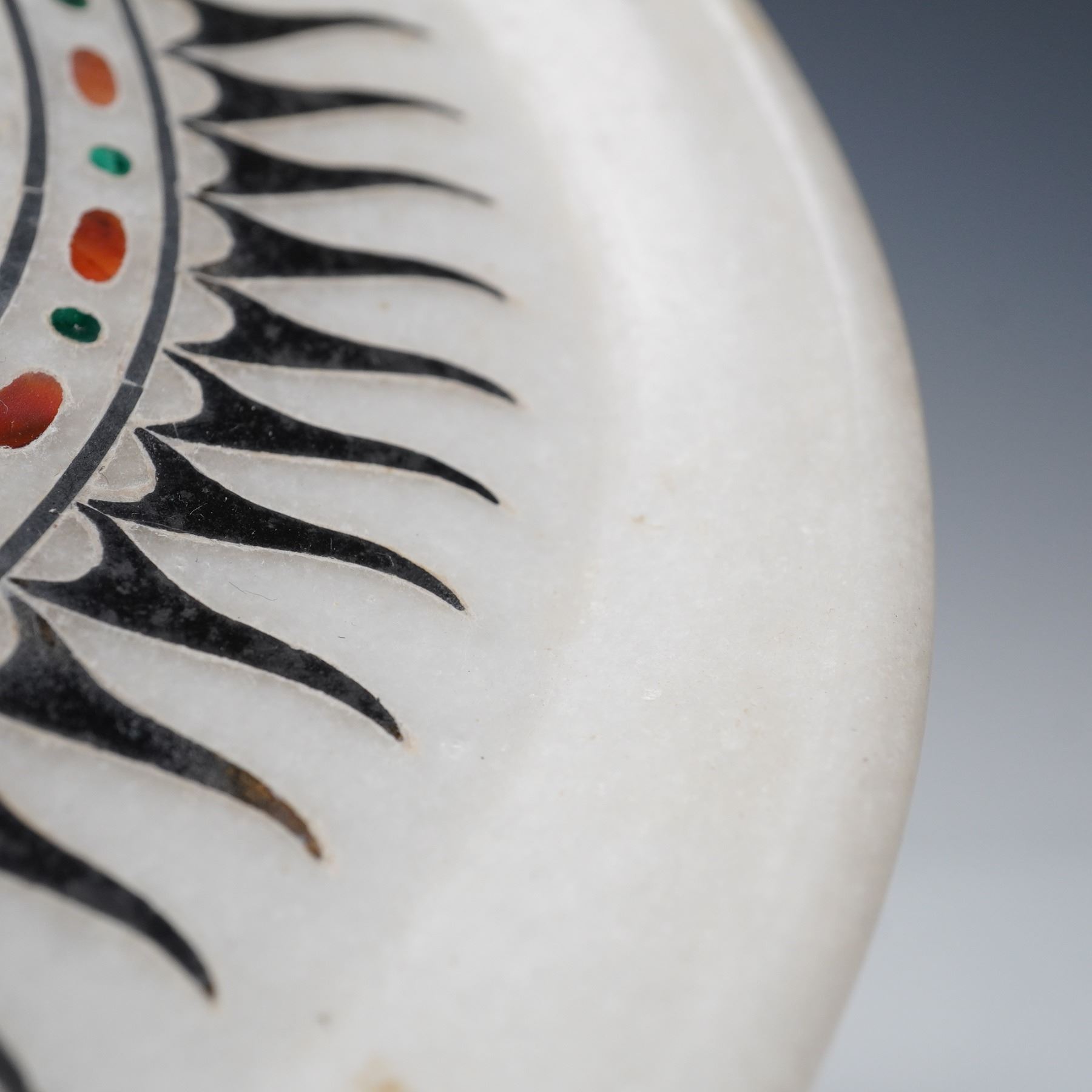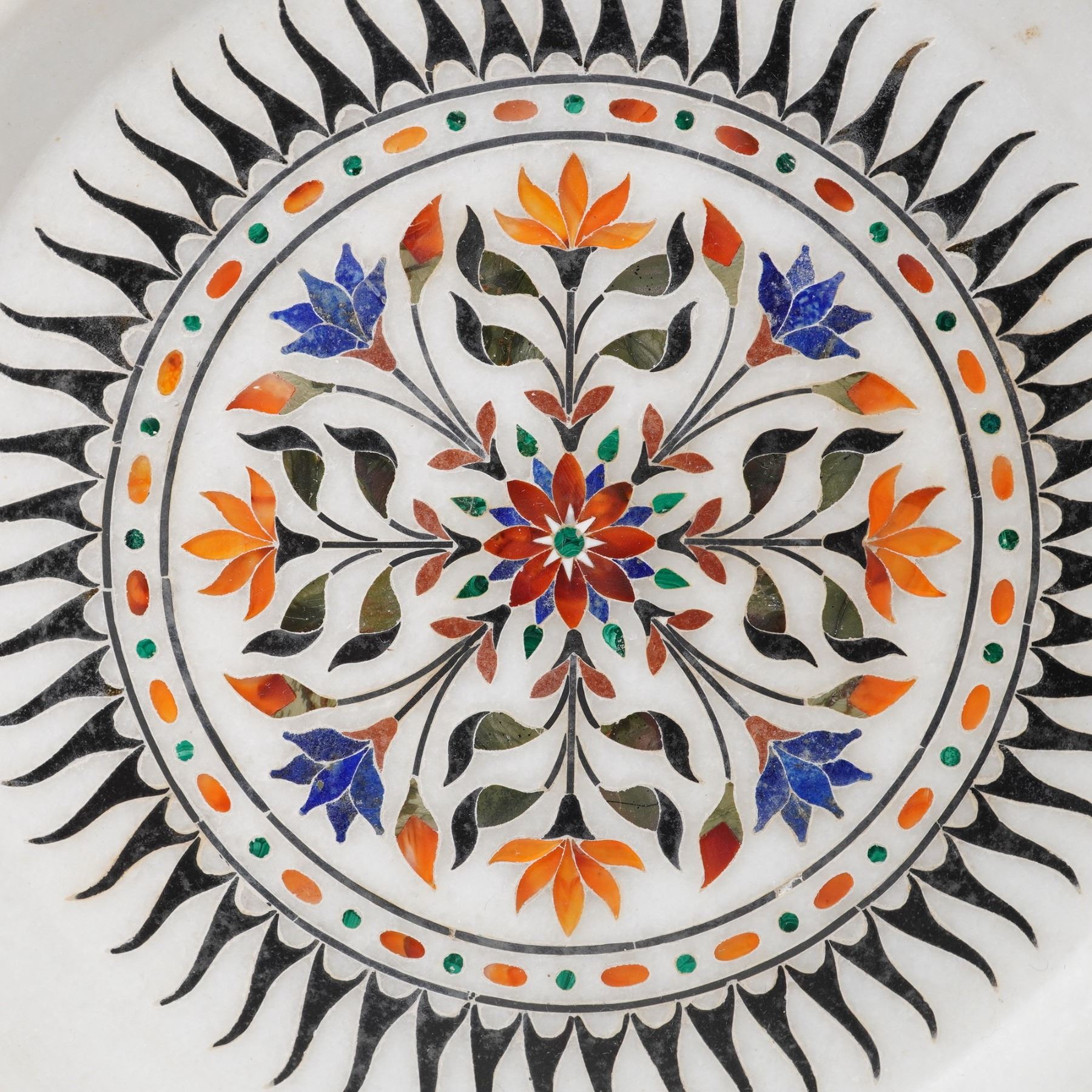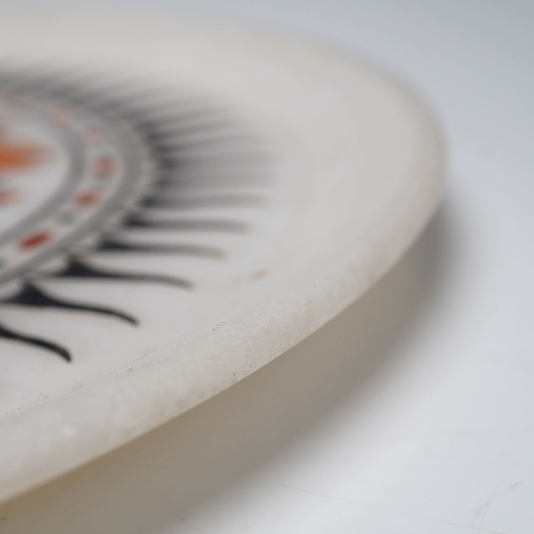 An intricately handcrafted circular marble plate featuring colorful pietra dura-style inlay. The central medallion is decorated with a symmetrical floral motif of orange, blue, green, and red hardstone inlays, surrounded by radiating black leaf-like designs. This decorative technique, reminiscent of Mughal craftsmanship found in Agra, India, showcases the artistry of precision stone inlay on white marble. The reverse is plain and unadorned.