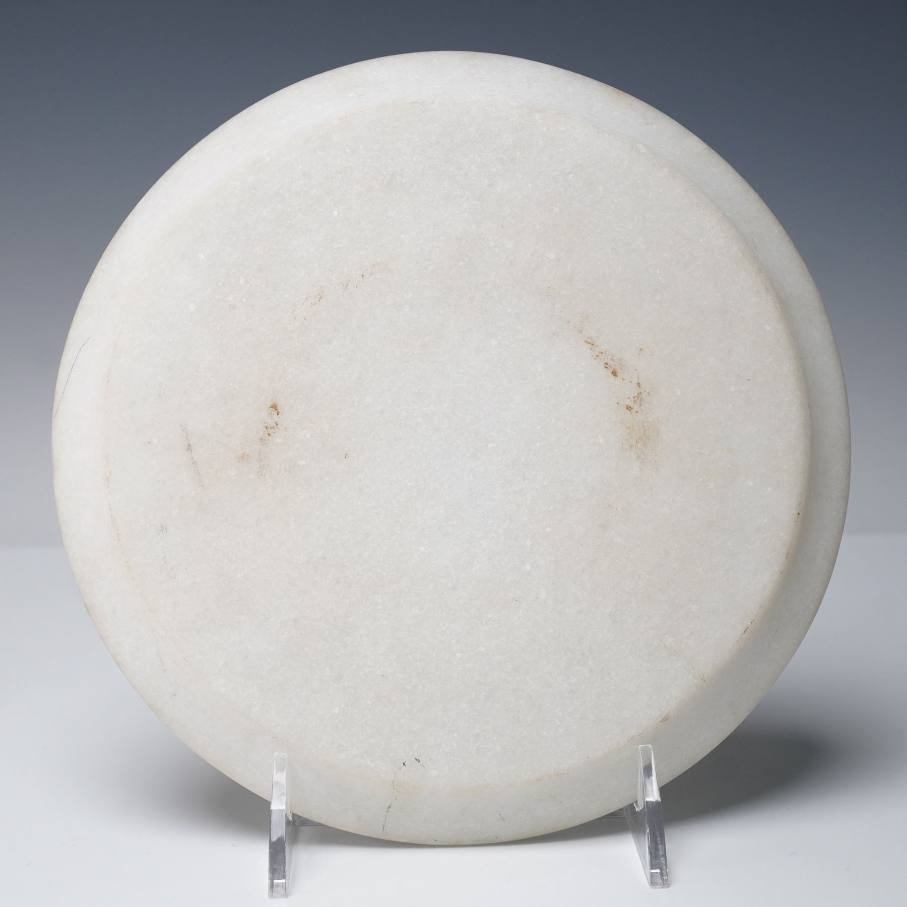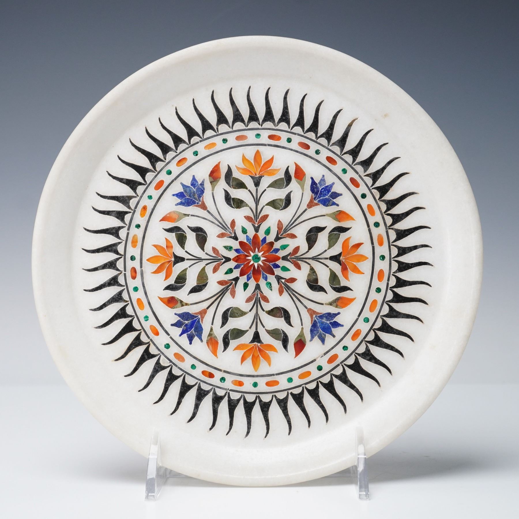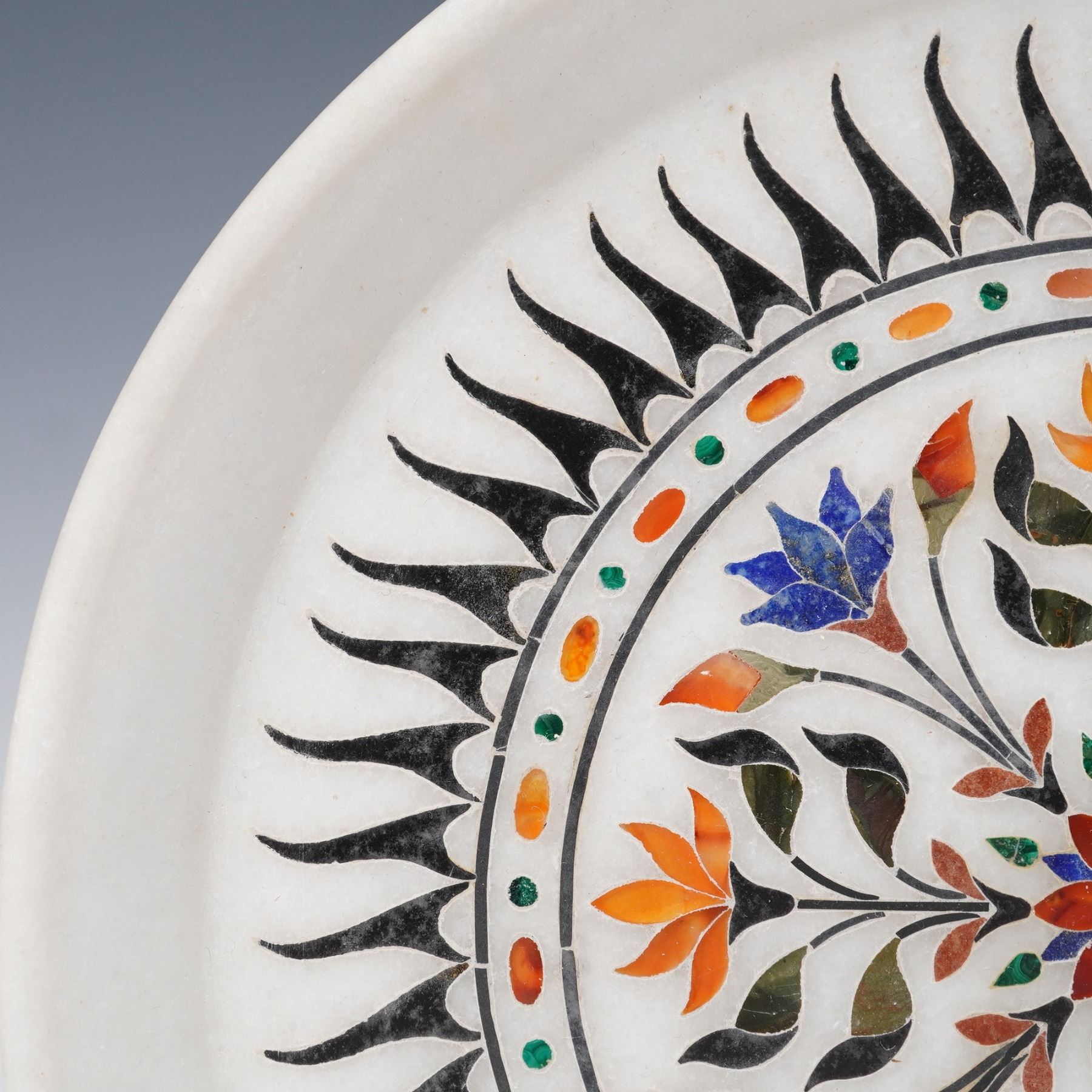 An intricately handcrafted circular marble plate featuring colorful pietra dura-style inlay. The central medallion is decorated with a symmetrical floral motif of orange, blue, green, and red hardstone inlays, surrounded by radiating black leaf-like designs. This decorative technique, reminiscent of Mughal craftsmanship found in Agra, India, showcases the artistry of precision stone inlay on white marble. The reverse is plain and unadorned.