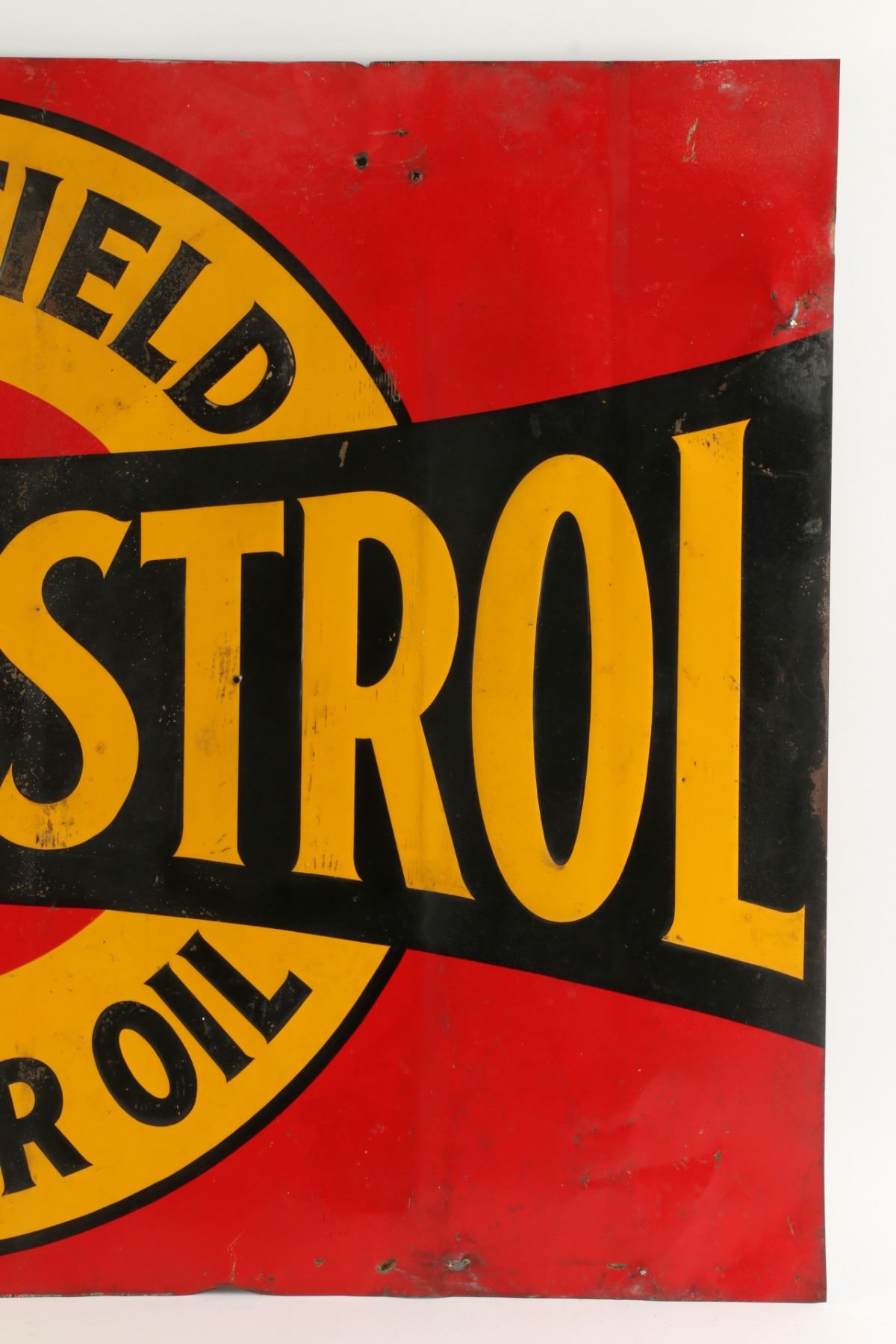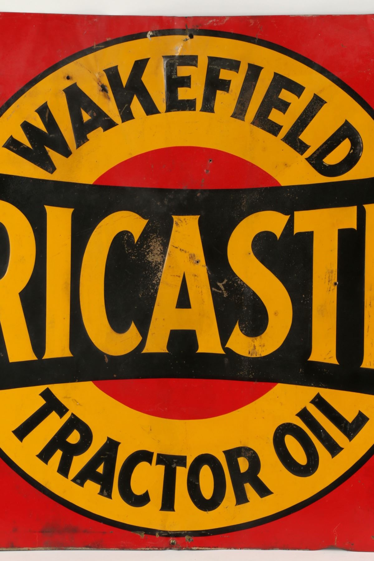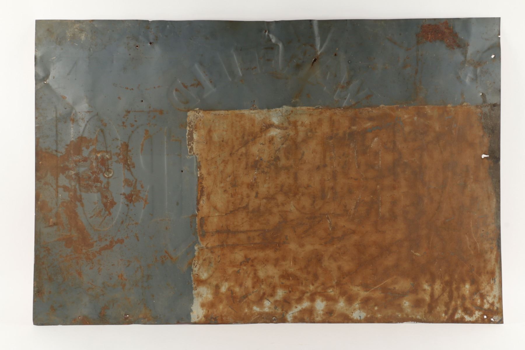Canadian. Circa 1930. Rare. Embossed. Marked, "St. Thomas Metal Signs Ltd. St Thomas Ont," middle lower edge. 35.5" x 23". Scattered flakes, staining and oxidization. Shallow bends and mounting perforations. $400-600.