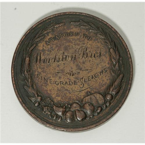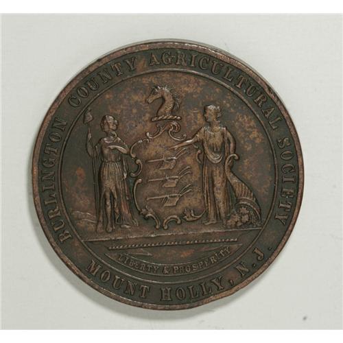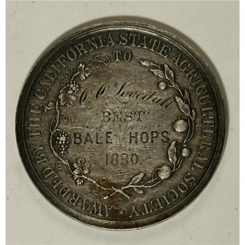 <B>Agricultural Award Medal Group Lot.</B></I> Consists of two award medals. The first, dated 1880, bears the legend Awarded by the California State Agricultural Society to O.O. Lovedall for Best Bale-Hops, struck in silver, about 44 mm, weight 40 gm. The second piece was awarded by the Burlington County Agricultural Society, Mount Holly, N.J., to Woolston Bros. for Fine Grade Sleighs, struck in bronze, approximately 45 mm and weighing 49.7 gm, a bit dark, with an uneven surface and some minor rim bumps. The market value is approximately $150-$200.<BR><BR><b>Shipping:</b> Coin/Currency (<a target="_blank" href="http://www.heritageauctions.com/common/shipping.php">view shipping information</a>)