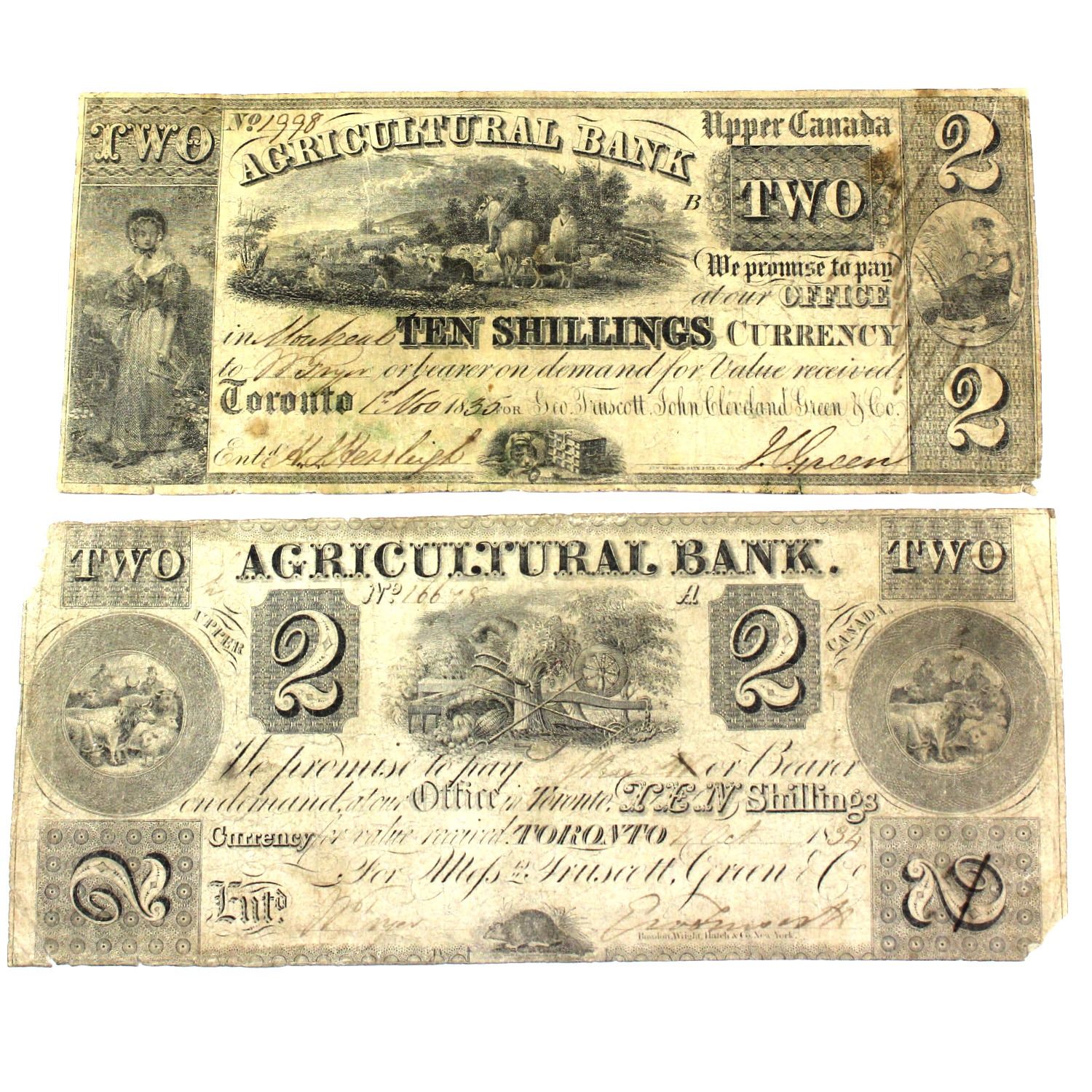 Agricultural Bank 20-10-06 1834 $2 Fine (dam'g) & 20-12-02-06 1835 $2 Fine (holes). 2pcs.