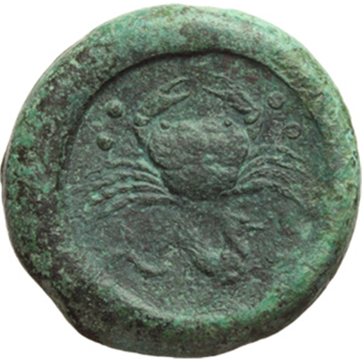 Mondo Greco. Sicilia. Agrigentum. Emilitra, 425-406 a.C. D/ Aquila con le ali aperte a destra ghermisce lepre. R/ Granchio. Intorno, sei globetti. Sotto, mostro marino a destra. ANG ANS 1023. AE. g. 21.12 mm. 31.00 Bella patina verde. MB/BB.