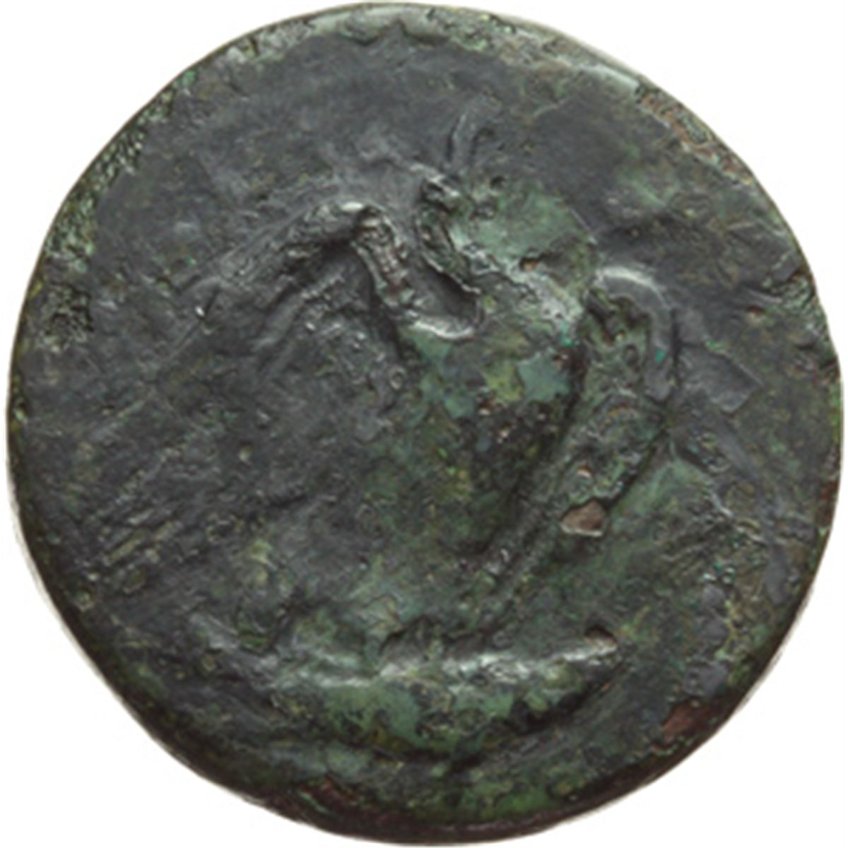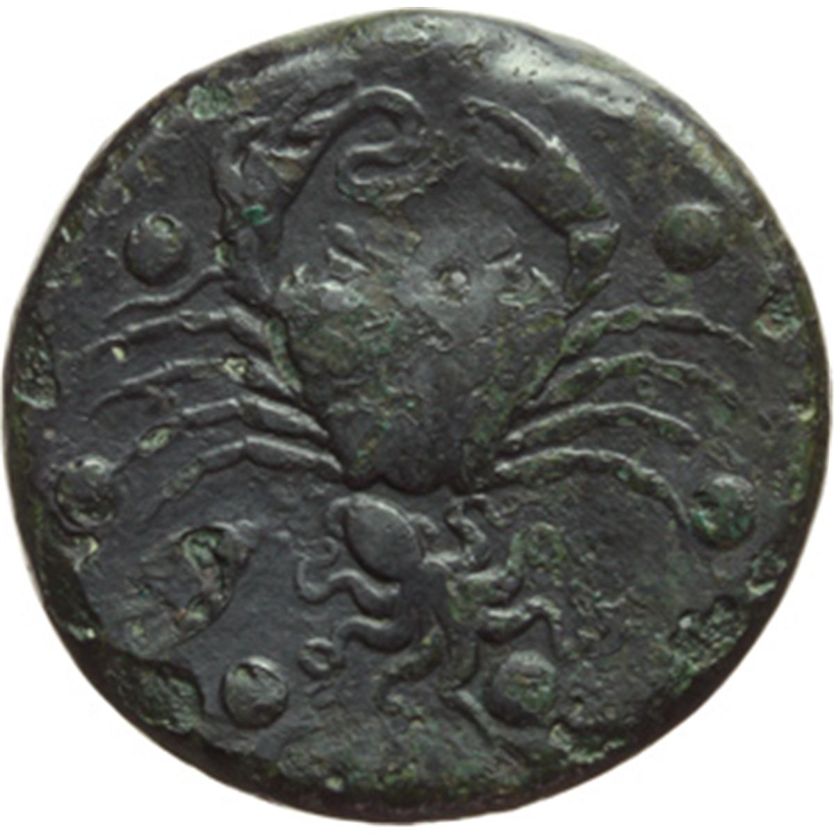 Mondo Greco. Sicilia. Agrigentum. Emilitra, 425-406. D/ Aquila con le ali aperte a destra ghermisce pesce. Nel giro, tracce di etnico. R/ Granchio che afferra serpente di mare. Intorno, sei globetti. Sotto, conchiglia e polipo. SNG ANS 1031. AE. g. 23.69 mm. 27.00 BB.