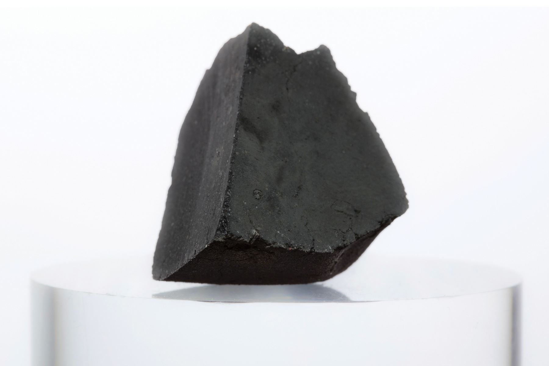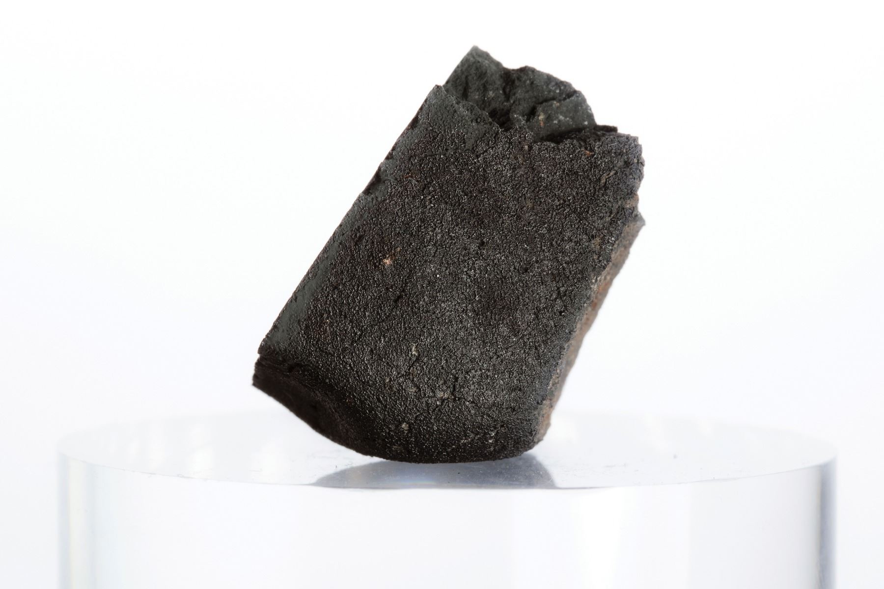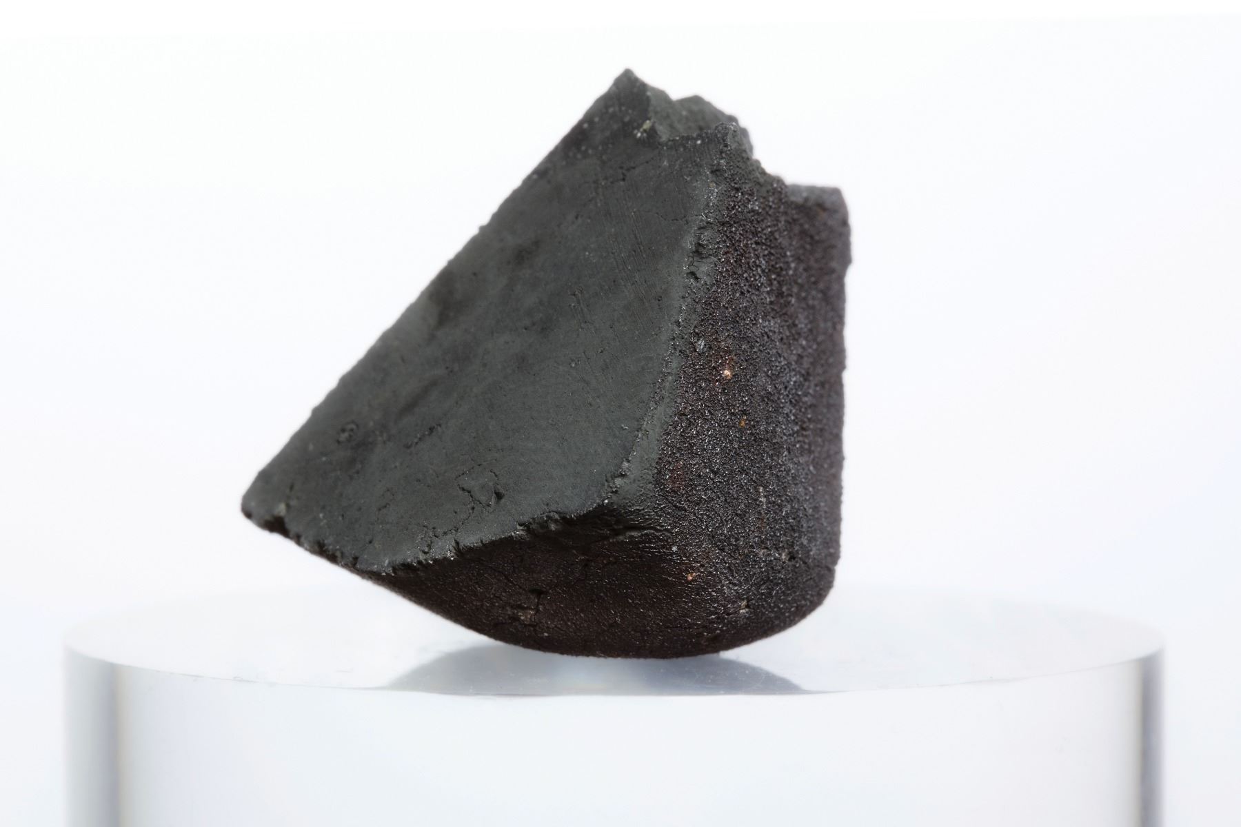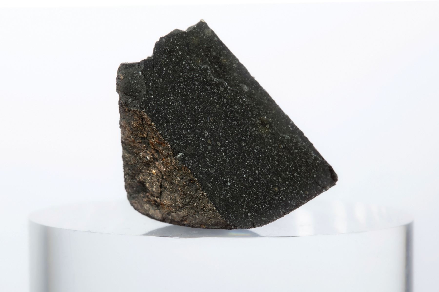 Carbonaceous chondrite, CM2. Witnessed fall, Alajuela, Costa Rica, April 23, 2019. Partial end cut with fusion crust weighing 13.0 grams and measuring 27 mm x 20 mm x 18 mm. Part end cut with highly-polished face showing abundant tiny chondrules, and an interior with rich, matte black fusion crust, reminiscent of a charcoal briquette, as is expected from this rare and carbon-bearing meteorite.