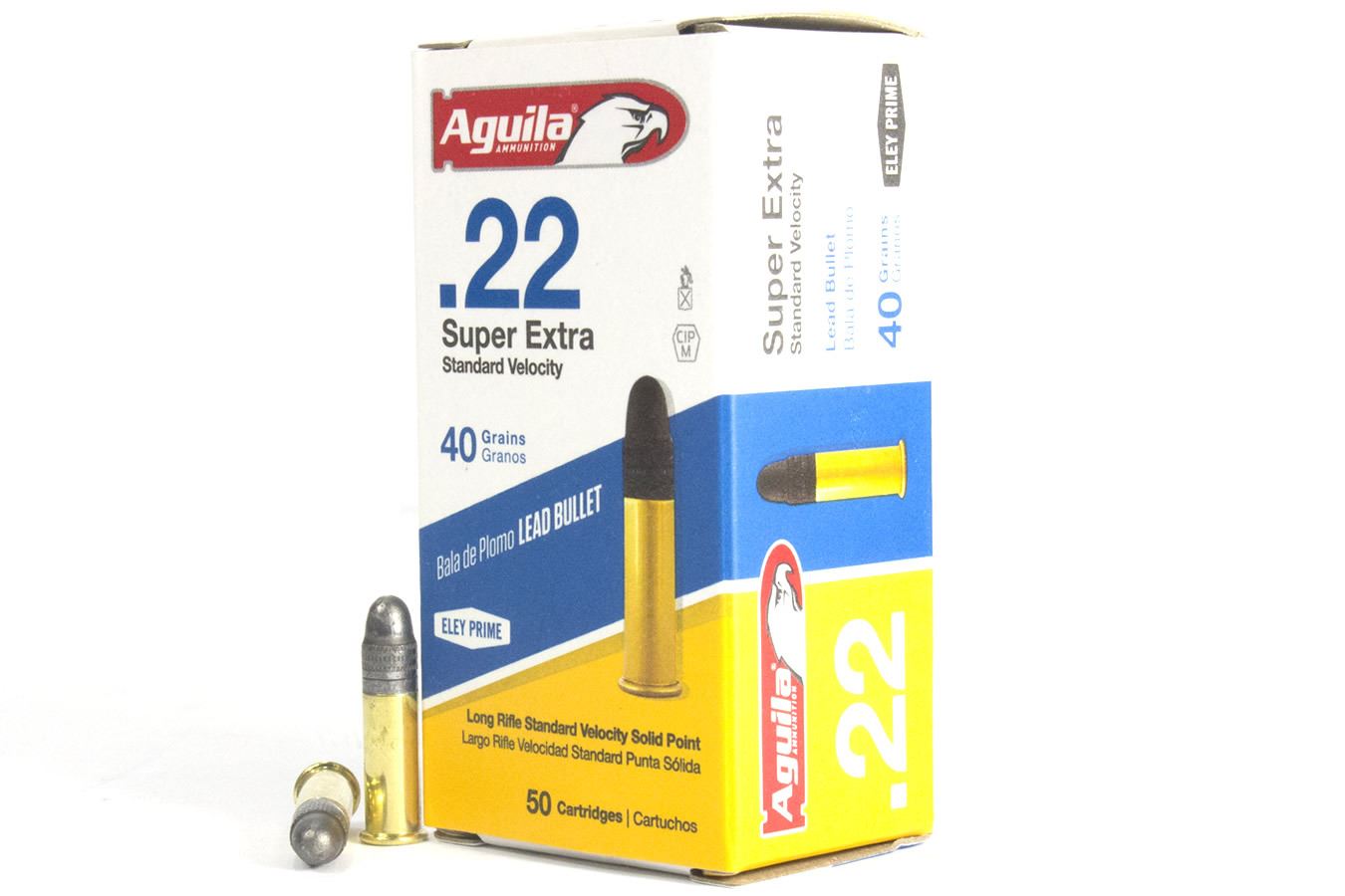 Caliber: 22LR Bullet Weight: 40 gr Bullet Type: Lead Round Nose Quantity: 50 Rounds per box Aguila .22LR Super Extra Standard Velocity ammunition uses ELEY technology, the same used by Olympic shooting teams, and clean combustible powders to offer maximum output at controlled pressures