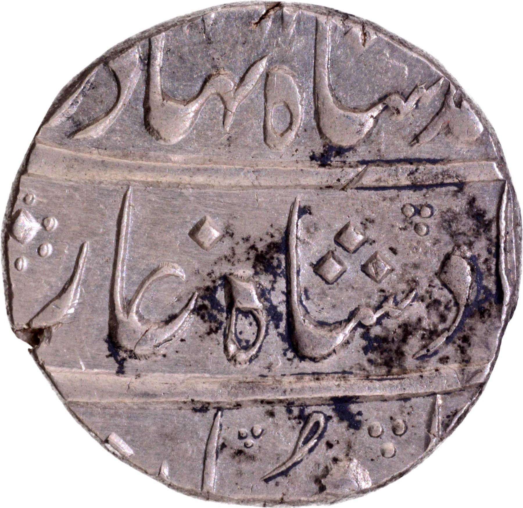 Ahmad Shah Bahadur ( AH 1161-1167 /1748-1754 AD), Ujjain Dar ul-Fath Mint, Silver Rupee, Ahad RY, Obv: Persian legend "Sikka Mubarak Badshah Ghazi Ahmad Shah Bahadur", Rev: Persian legend "sana Ahad julus" & "zarb Ujjain" with the epithet "Dar-ul-fath" at the bottom, 11.50g, 22.85mm, (Unlisted in KM), test mark on the edge, sharp struck, about extremely fine, Very Rare.