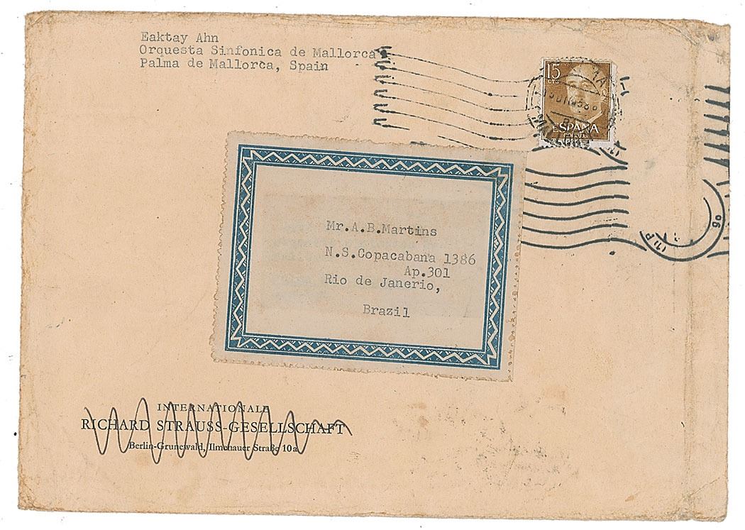 Sheet music booklet for the 'Korean National Hymn, 'Ai Kook Ka,'" two pages, 8.25 x 12.25, prominently signed and inscribed on the front cover in ink, "To Mr. A. B. Martins, Very kind remembrance, Ahn Eak-tai, November 1958, Palma de Mallorca." In very good to fine condition, with light toning, scattered light foxing and a central horizontal fold. Accompanied by the original mailing envelope.
