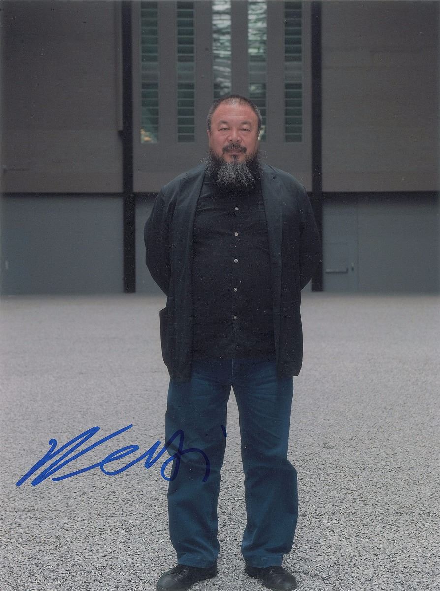 Chinese Contemporary artist and activist (born 1957). Appealing color satin-finish 8.25 x 11 photo of Weiwei with his arms behind his back, signed in blue felt tip. In fine condition. Consignor notes that the signature was obtained in person in Berlin in September of 2015.