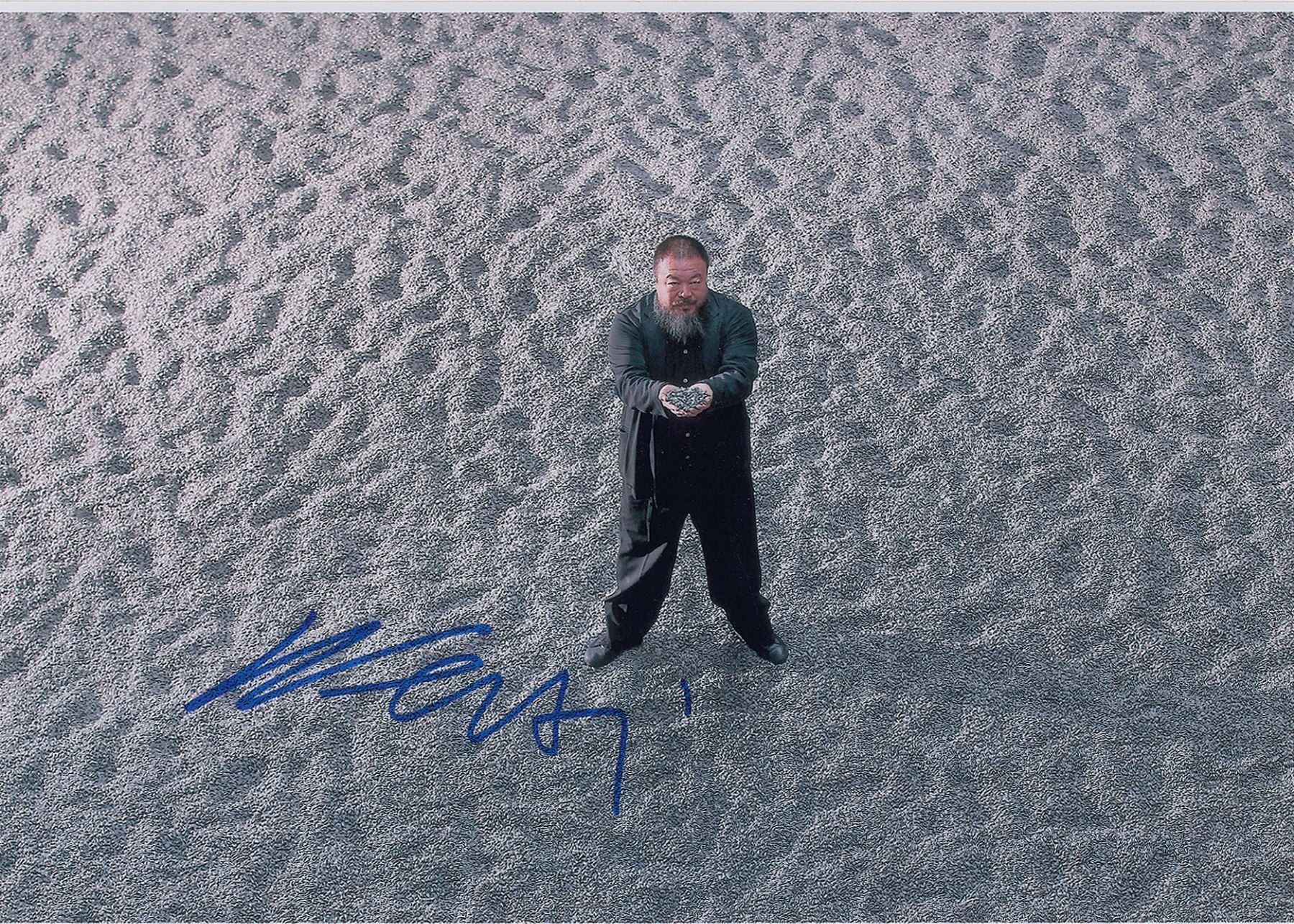Color satin-finish 11 x 8 photo of Ai Weiwei posing amidst millions of his hand-painted porcelain sunflower seeds, signed in blue felt tip. In very fine condition.