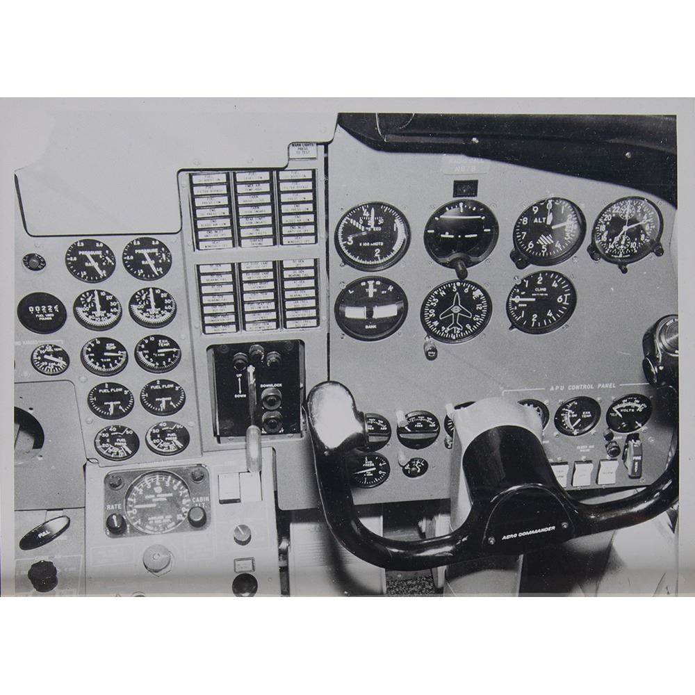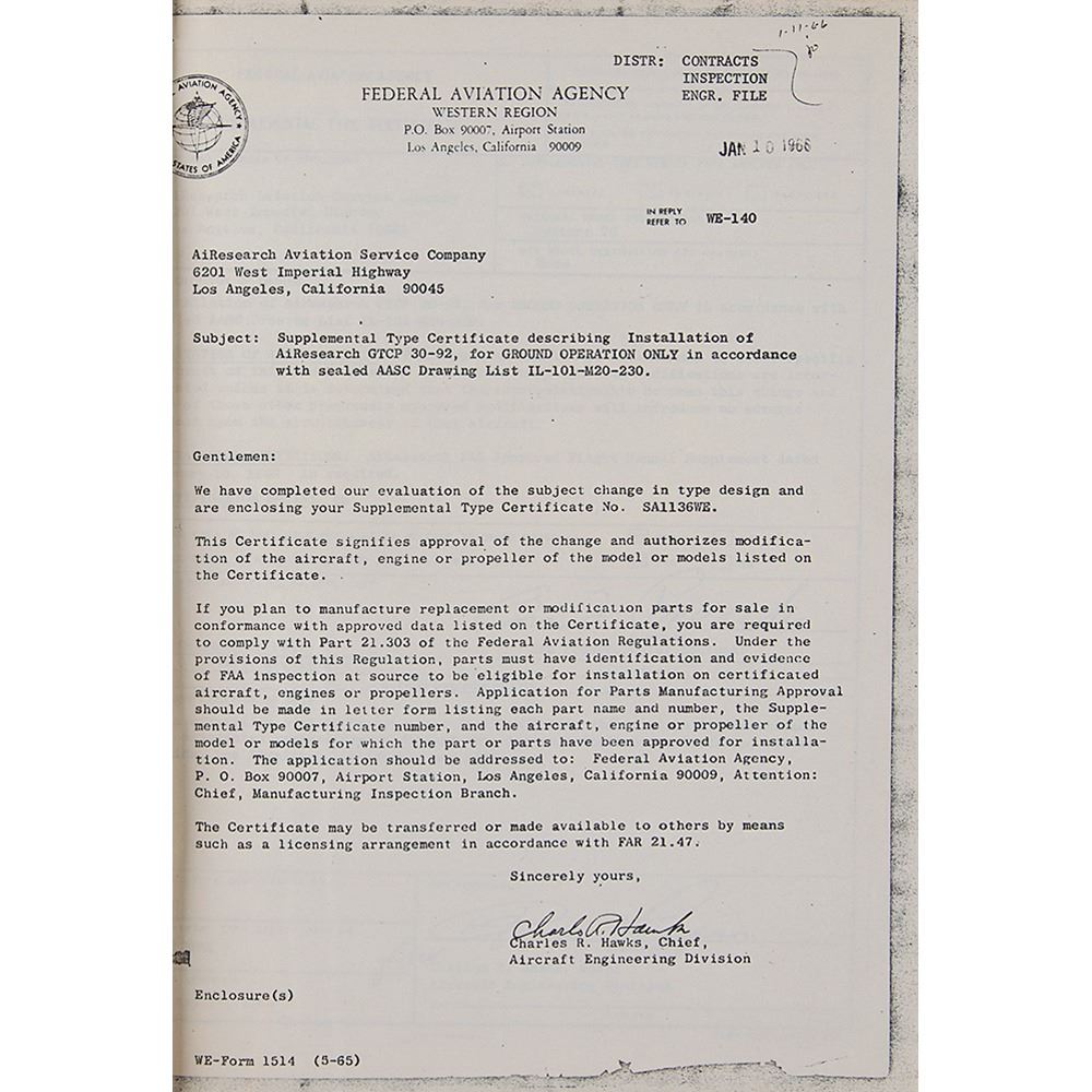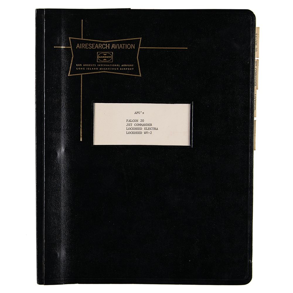 AiResearch Aviation binder containing documents and photographs affiliated with the Dassault Falcon 20, Aero Commander Jet Commander, Lockheed Electra, and Lockheed WV-2, circa late 1960s. The binder contains copies of Federal Aviation Agency supplemental certificates and a total of twelve original glossy photographs of aircraft components. In fine condition.