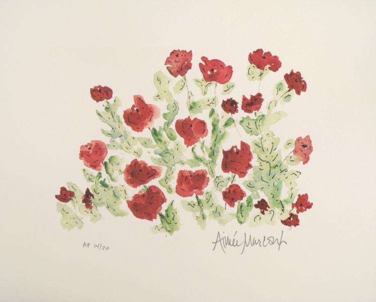 This artist is recognized for her floral themed art, and this is a prime example, with beautiful red flowers. * Artist: Aimee Marcoix Edition: Numbered Artist Proof, Marked AP 14/20, lower left Size: 8" x 10" Condition: Excellent