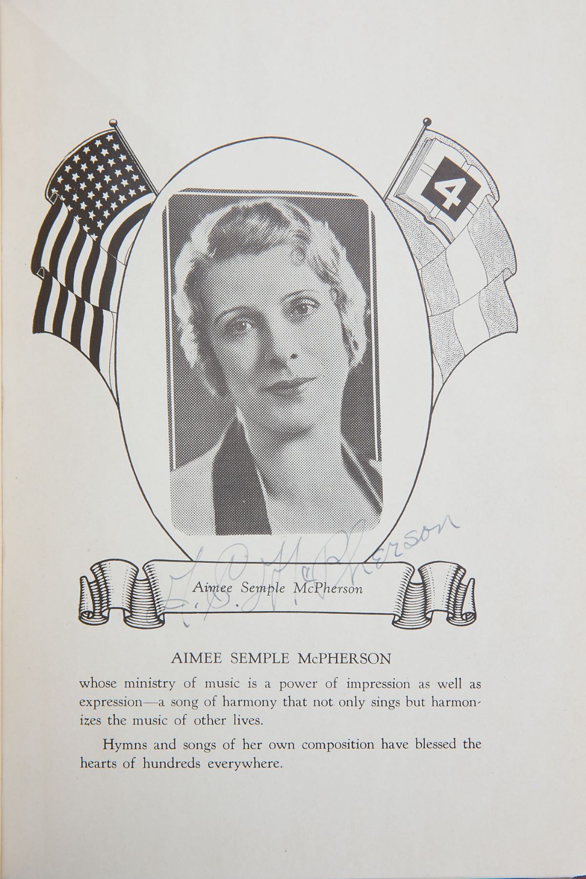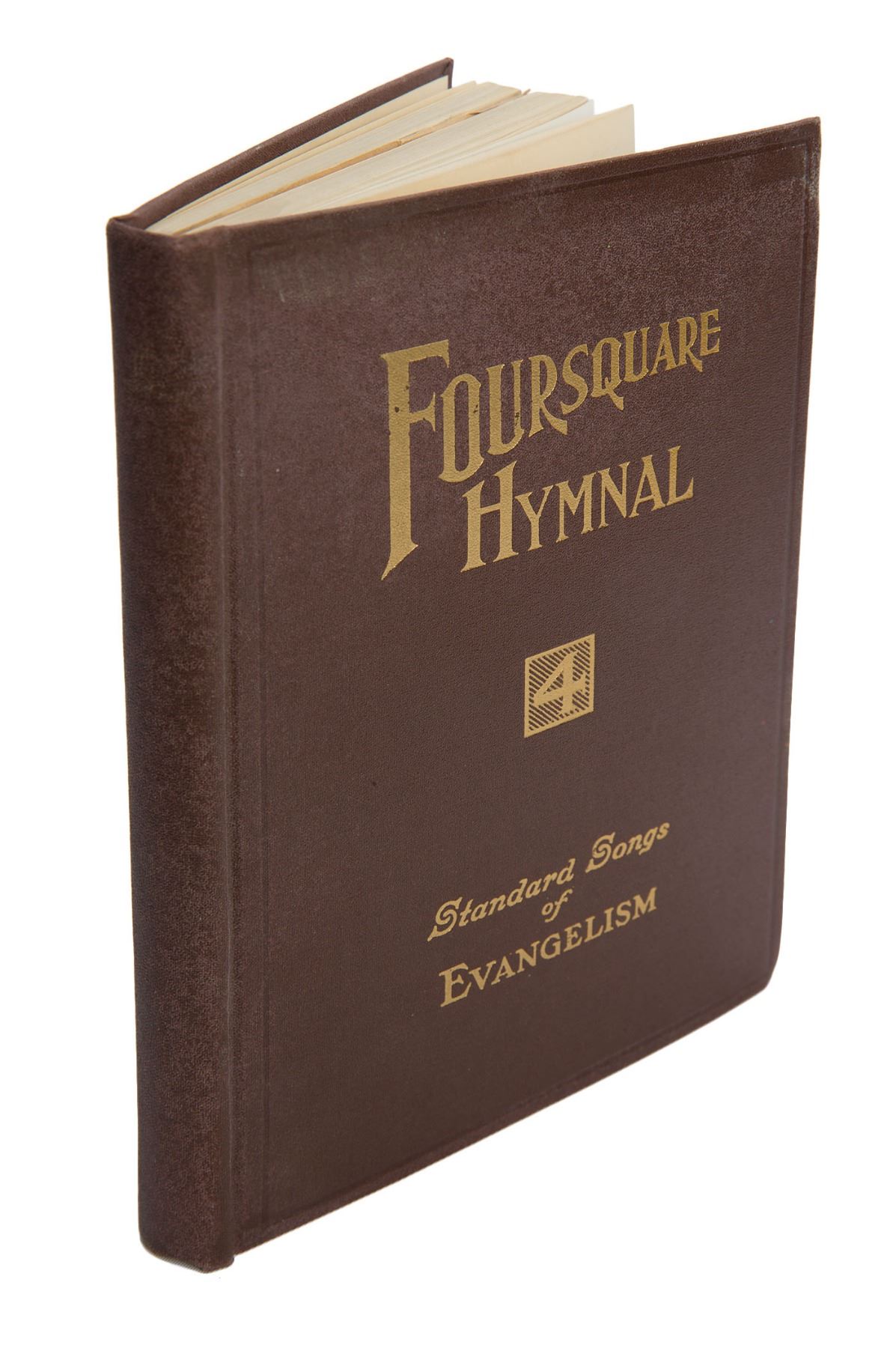 Signed book: Foursquare Hymnal of Standard Songs of Evangelism. Los Angeles: Aimee Semple McPherson Publishing Co., 1938. Hardcover, 6 x 8.25, unpaginated but featuring music for 293 hymns. Signed on an opening biographical page in fountain pen, "A. S. McPherson." In fine condition.
