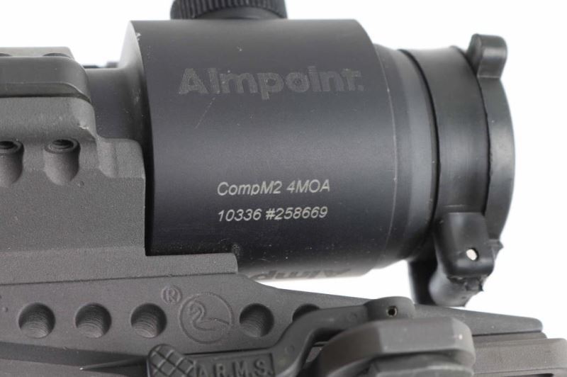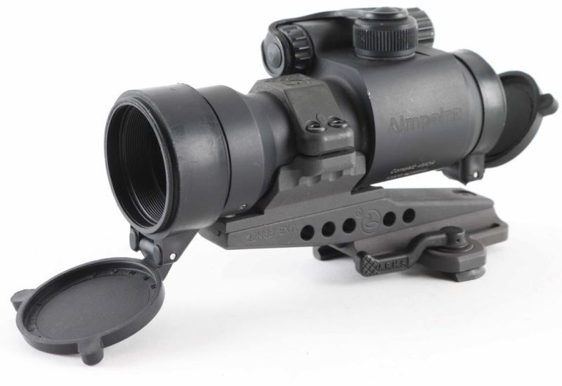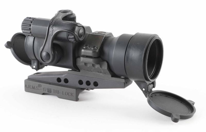 High quality non-magnifying red dot scope mounts to a Picatinny flat top rail using the included ARMS quick throw lever base. Optic is clear, red dot is bright (adjustable to several settings), includes flip-up lens covers.