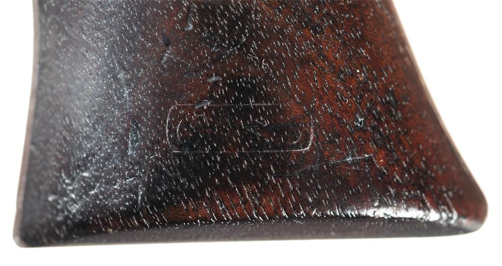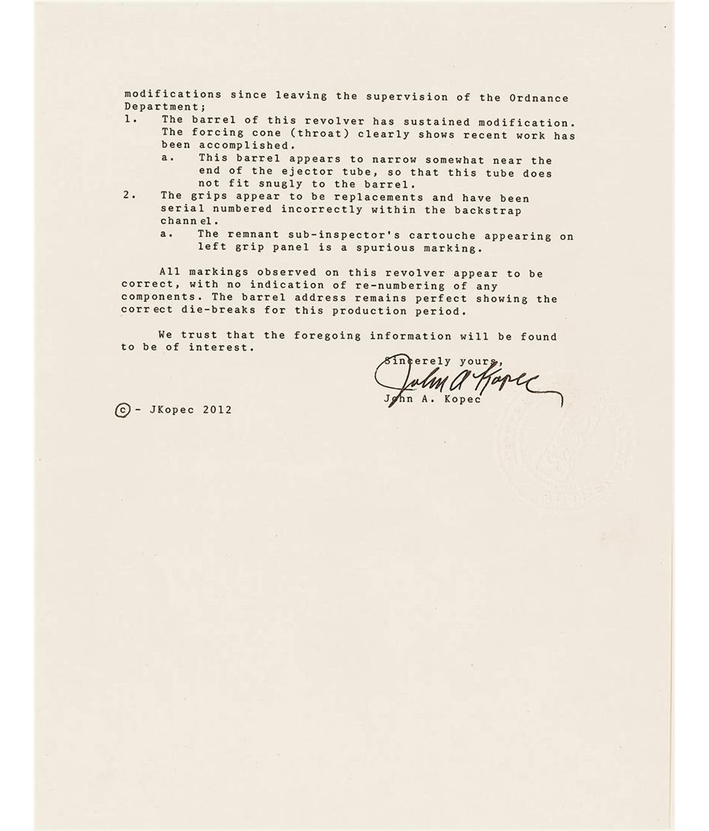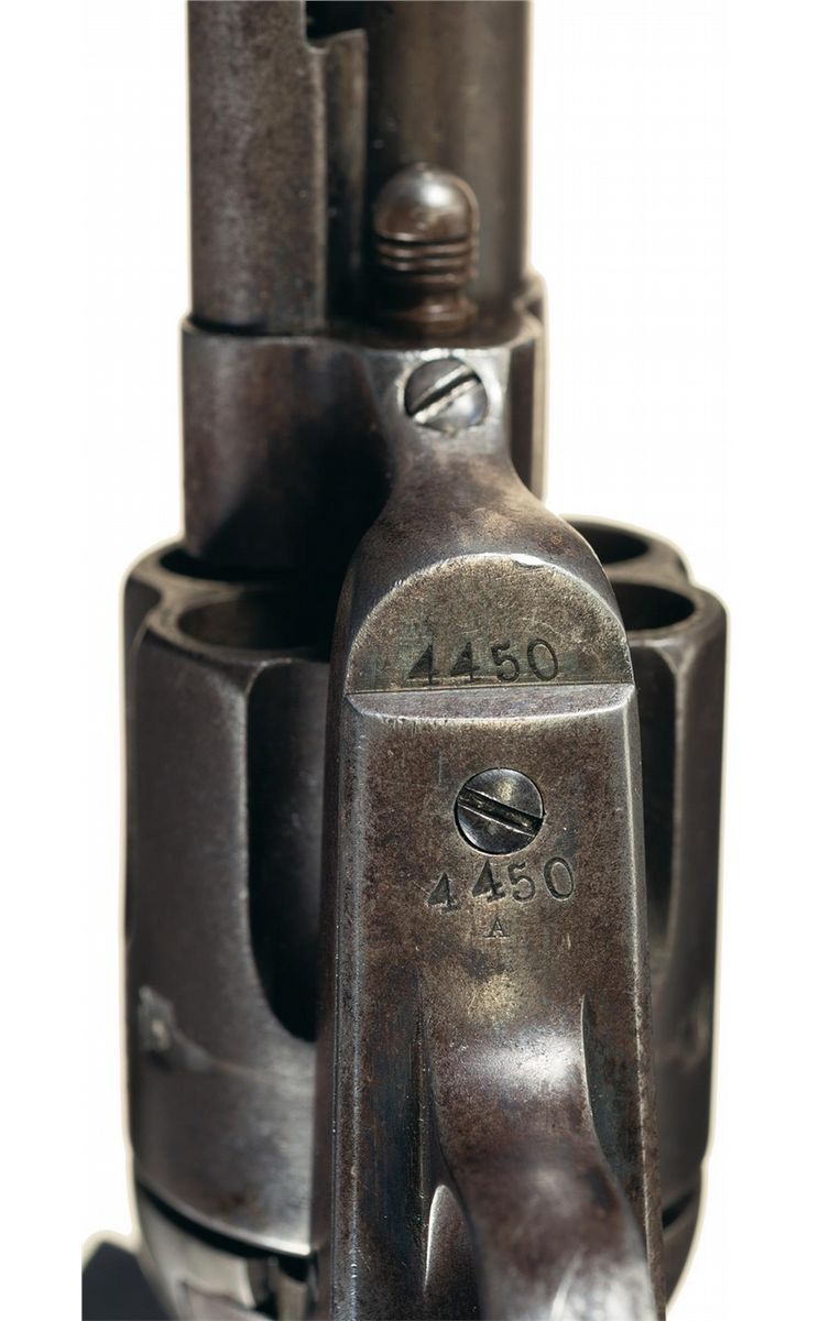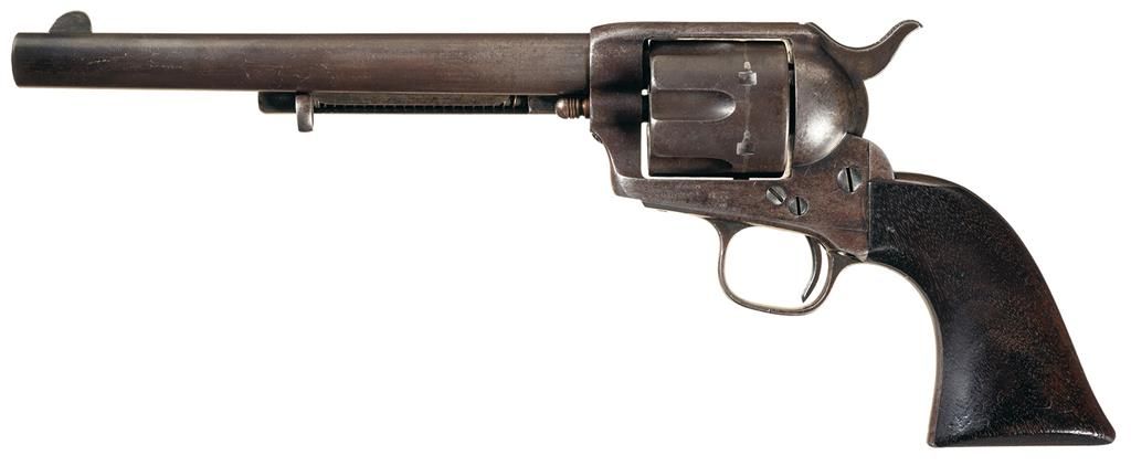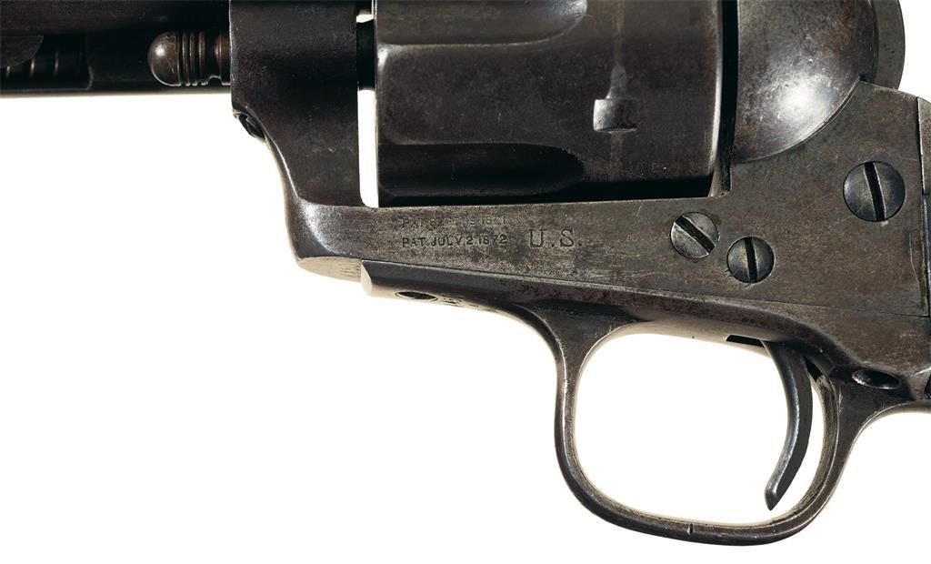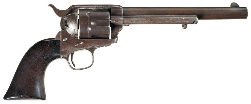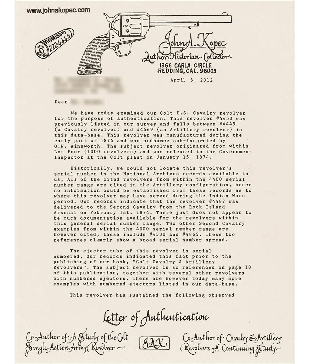 This is an example of a U.S. Ainsworth inspected Pre-Custer Battle Colt Single Action Army Cavalry Model revolver that was manufactured in 1874. This Government Contract Single Action was inspected by Ordnance Sub-Inspector Orville W. Ainsworth and has his "A" sub-inspection mark stamped on major components. The revolver has the distinctive early production features which include the First Style two-line, two-patent date markings on the left side of the frame followed by "U.S.", one-line script barrel address and "bullseye" ejector rod head. The hammer spur has elongated bordered knurling. The small "A" Ainsworth sub-inspection mark is stamped on the underside of the barrel, on the trigger guard directly below the serial number, on the top of the back strap and on the side of the cylinder. A small "P" proofmark is stamped on the underside of the barrel and on the side of the cylinder. The matching serial number is marked on the barrel, ejector rod housing, frame, trigger guard, back strap and cylinder. The assembly number "240" is stamped on the loading gate. This revolvers serial number is listed with a number of Single Action Army serial numbers of revolvers that have the serial numbered ejector rod housing on page 18 of Kopec's "Colt Cavalry & Artillery Revolvers a Continuing Study". The revolver is fitted with a replacement, one-piece smooth walnut grip with a spurious boxed cartouche on the lower left side. These early revolvers were primarily issued to the ten cavalry regiments on the frontier, including the 7th Cavalry, and were used throughout the Indian Wars. After 1895, nearly all of the surviving revolvers were recalled and overhauled to "Artillery" configuration and subsequently issued during the Spanish-American War and Philippine Insurrection. The accompanying Kopec letter states that this revolver falls between the Cavalry revolver #4449 and Artillery revolver #4469 in his database. The revolver was originated from within Lot 4 (1,000 revolvers) released to the Government Inspector at the Colt factory on January 15, 1874. The letter also cites three Cavalry revolvers, numbers 4330, 4865 and 4487 that were delivered to the 2nd Cavalry from the Rock Island Arsenal on February 1, 1874. After examining the revolver, Kopec concluded that the forcing cone clearly shows recent work. The barrel appears narrow near the end of the ejector tube, so that the tube does not fit snugly to the barrel, the grip appears to be a replacement incorrectly numbered on the back strap channel and the remnant of the cartouche on the left grip is spurious. He also notes that all the markings appear correct and there is no indication of any re-numbering, and the barrel address shows the correct die breaks for this period.