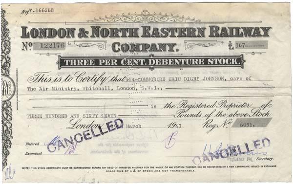1943, London, England. Three Per Cent Debenture Stock of the London & North Eastern Railway Company. Black. Litho. Issued to Air Commodore Eric Digby Johnson (1892 - 1971). He fought in the both the First World War and Second World War. Stamp and punch cancelled. Fine.