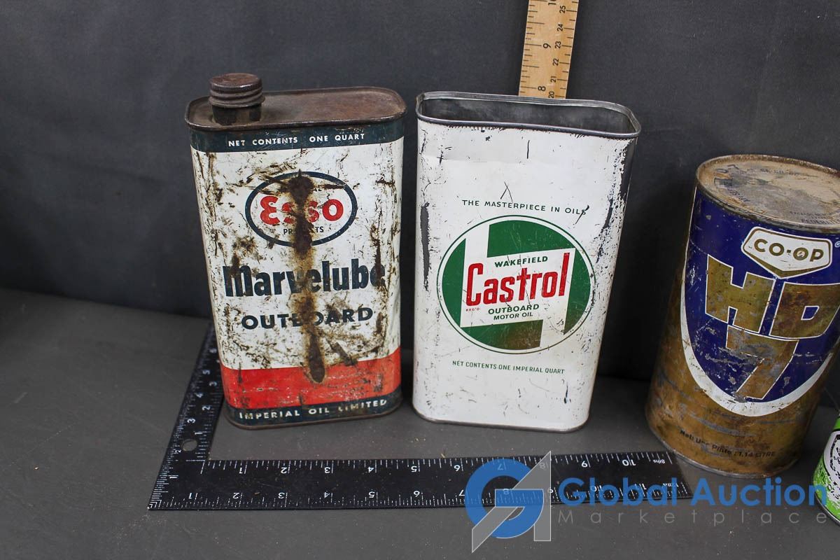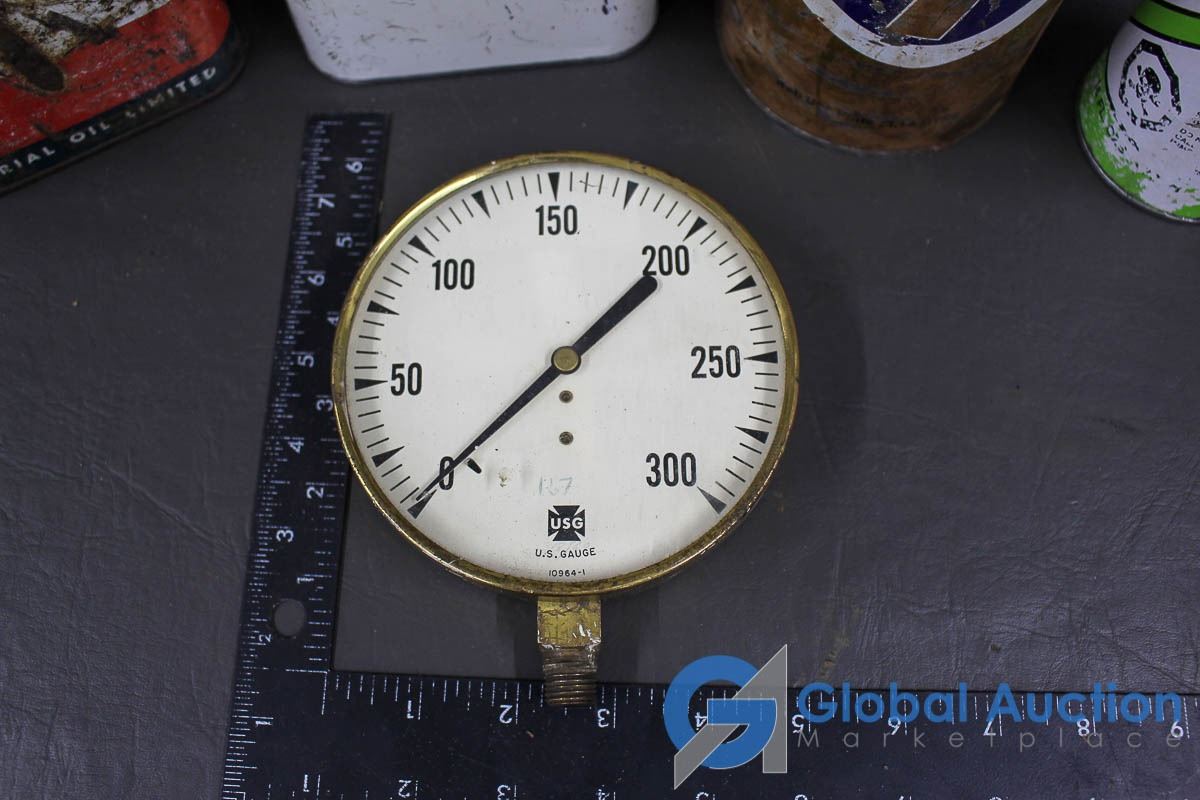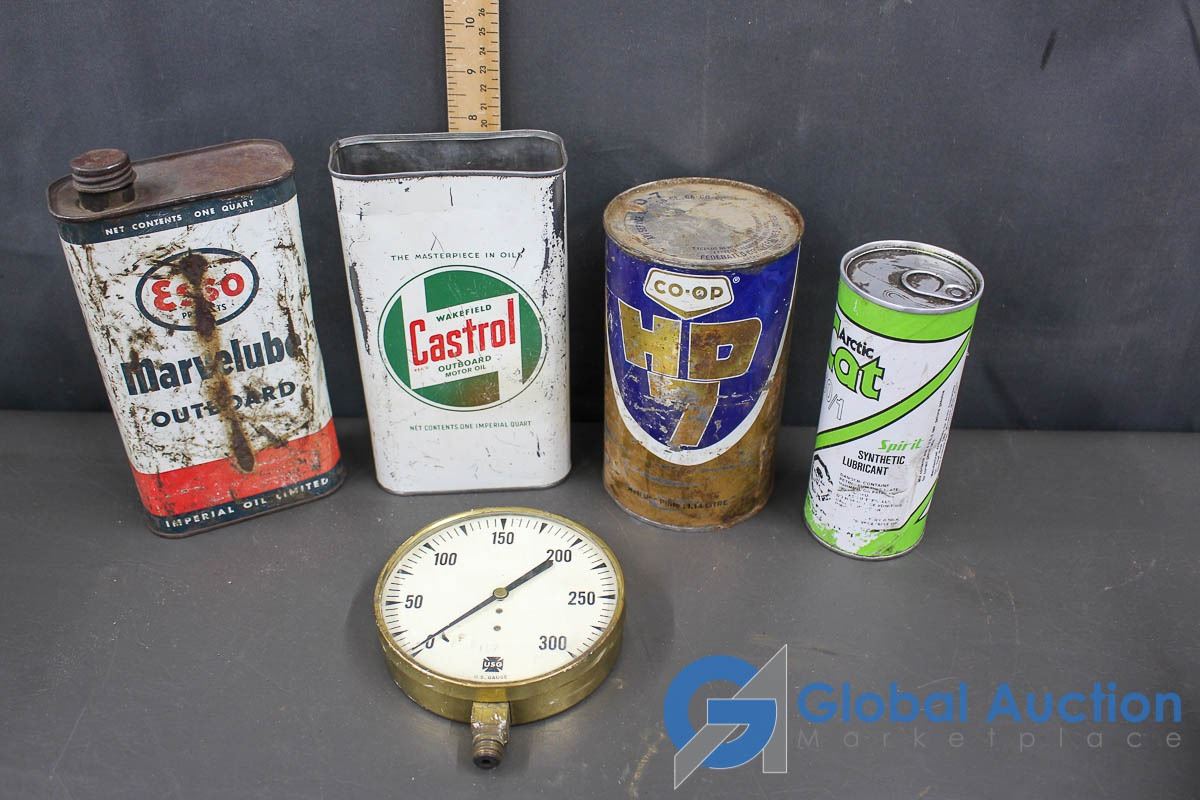 Air Compressor Gauge, 4 Tins of Motor Oil (2 empty)