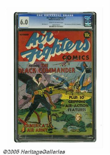 <B>Air Fighters Comics #1 (Hillman Fall, 1941) CGC FN 6.0 Cream to off-white pages.</B></I> Here is the premiere issue of a series that ran for 22 issues bearing this title, then another decade as <B>Airboy</B></I>. The cover spotlighted the Black Commander -- and we encourage you to cherish every panel of his story, as it was his only appearance. Overstreet 2005 FN 6.0 value = $738. CGC census 4/05: 1 in 6.0, 4 higher.