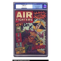 Air Fighters Comics #2 (Hillman 1942) CGC FN/VF 7.0 Light tan to off-white pages. Produced by Quality artists and Charles Biro for Hillman, this comic sports an amazingly gory cover by Biro and features the origin and debut of Airboy and the Iron Ace. The beautiful Black Angel, Flying Dutchman and Skywolf also make their first appearance. A major key book, in uncommon condition, it's also a Gerber "6," with only 50-200 copies estimated to exist in any condition. Overstreet 2002 FN 6.0 value = $1,000; VF 8.0 value = $2,083. Important notice: We expect to be auctioning lots at the rate of 200-250 per hour. Sometimes eBay Premier live bid software cannot keep up with that pace, so we strongly recommend that you place a realistic proxy bid now as insurance to avoid disappointment. Also please note that all Heritage/CAA lots purchased through eBay Premier carry a 20% Buyer's Premium. Please make sure you read the Terms and Conditions.