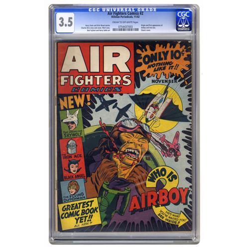 <B>Air Fighters Comics #2 (Hillman Fall, 1942) CGC VG- 3.5 Cream to off-white pages.</B></I> Airboy made his first appearance in this issue, piloting his "bat-plane" with its flapping wings (later known as "Birdie") into battle. This comic came out a year after the first issue, with completely new writers and artists and new characters too -- Skywolf and the Iron Ace also debuted here. Charles Biro is credited with the hard-hitting Japanese war cover. Overstreet 2006 VG 4.0 value = $736. CGC census 4/06: 1 in 3.5, 15 higher.