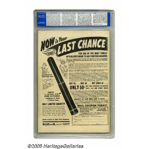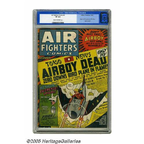 <B>Air Fighters Comics #3 (Hillman Fall, 1942) CGC VF 8.0 Cream to off-white pages.</B></I> Bombastic, patriotic covers were a staple of the title. In this issue: origin and first appearance of the Heap, the origin of Skywolf, and the second appearance of Airboy. Surpassed in CGC grade by just one other copy. Charles Biro cover, with Fred Kida and Bob Fujitani art. Overstreet 2005 VF 8.0 value = $1,156. CGC census 5/05: 1 in 8.0, 1 higher. <BR><BR><B>Important notice:</B> Heritage usually auctions material at the rate of 200-250 lots per hour. On some occasions eBay Live bid software or the Internet may not be able to keep up with the pace of the auction. We recommend placing a realistic absentee bid now as insurance to avoid disappointment. Occasionally the auctioneer may eliminate or reject an eBay Live bid, and the auctioneer may also reopen a lot after the close of the eBay live bidding (usually because we missed an audience bid), and may reject your bid even if it shows you as the winning bidder. By bidding via eBay Live, you agree that Heritage may award the lot to another bidder at its sole discretion under the circumstances described above or any other reasonable circumstances. Since eBay bids are not shown to us until we open the lot on the floor, we treat those bids just like floor bids. In most cases the floor responds before the eBay bid is presented to us, due to Internet lag time, so for consistency we have made it a policy that floor bids are always considered first over tie eBay live bids. Also please note that all Heritage lots purchased through eBay Live carry a 20% Buyer's Premium. Please make sure you read the Terms and Conditions before you bid. This lot is being auctioned in conjunction with a live floor auction by Heritage Galleries & Auctioneers. All final auction and invoice information will be supplied by Heritage Galleries & Auctioneers, and all other information should be considered preliminary. Lot:2250 <BR><BR><B>Winning Notification an