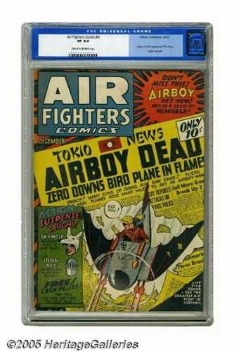 <B>Air Fighters Comics #3 (Hillman Fall, 1942) CGC VF 8.0 Cream to off-white pages.</B></I> Bombastic, patriotic covers were a staple of the title. In this issue: origin and first appearance of the Heap, the origin of Skywolf, and the second appearance of Airboy. Surpassed in CGC grade by just one other copy. Charles Biro cover, with Fred Kida and Bob Fujitani art. Overstreet 2005 VF 8.0 value = $1,156. CGC census 5/05: 1 in 8.0, 1 higher.