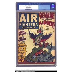 Air Fighters Comics #5 (Hillman 1943) CGC FN/VF 7.0 Cream to off-white pages. Air Fighters always had some of the most fun and imaginative war adventures. On this cover Airboy and his plane "Birdie" find themselves in the clutches of a giant Japanese octopus! Skywolf, Iron Ace and the other usual supporting characters are all there. Bob Fujitani art is featured, along with other Hillman talents. Overstreet 2002 FN 6.0 value = $285; VF 8.0 value = $597. Important notice: We expect to be auctioning lots at the rate of 200-250 per hour. Sometimes eBay Premier live bid software cannot keep up with that pace, so we strongly recommend that you place a realistic proxy bid now as insurance to avoid disappointment. Also please note that all Heritage/CAA lots purchased through eBay Premier carry a 20% Buyer's Premium. Please make sure you read the Terms and Conditions.