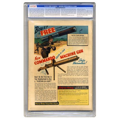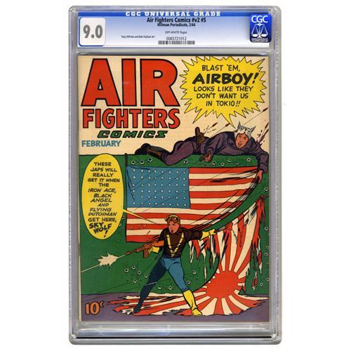 <B>Air Fighters Comics V2#5 (Hillman Fall, 1944) CGC VF/NM 9.0 Off-white pages.</B></I> This is the only copy of the issue graded above 8.0 by CGC as of this writing. It seems to be one of the more uncommon issues of the early run, and the flag cover sets it apart. The issue's artists include Bob "Fuje" Fujitani. Overstreet 2006 VF/NM 9.0 value = $660; NM- 9.2 value = $900. CGC census 3/06: 1 in 9.0, none higher.