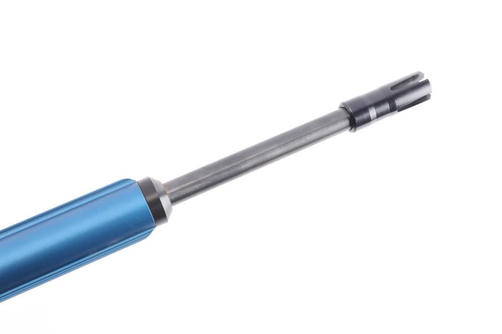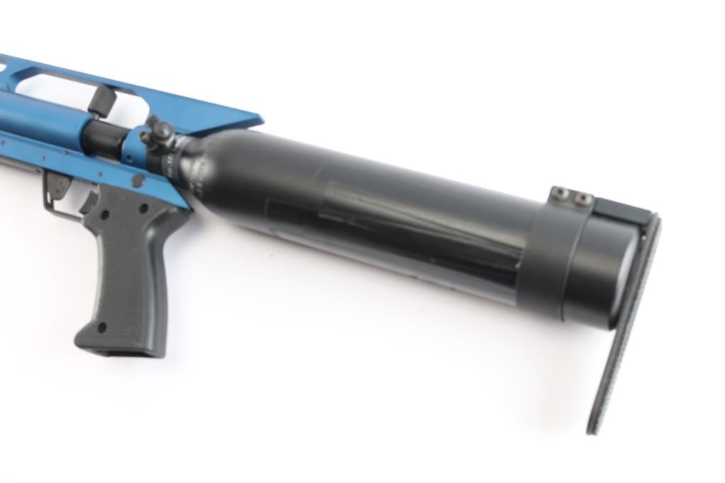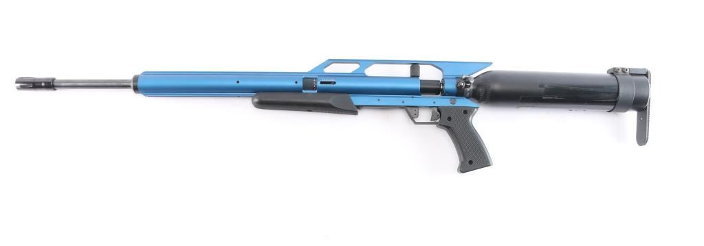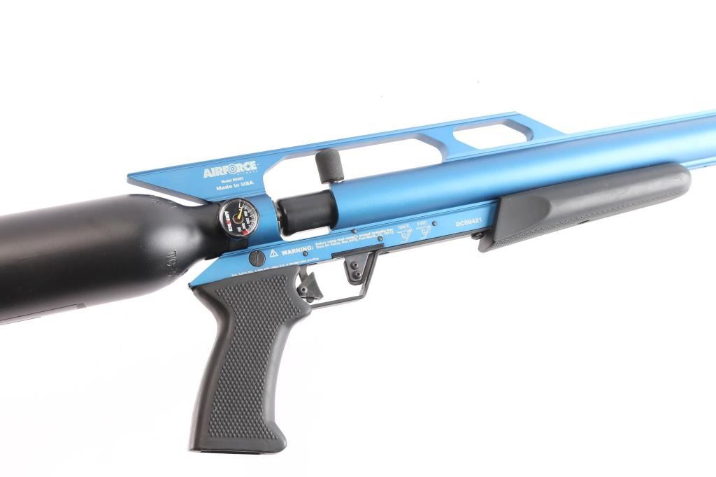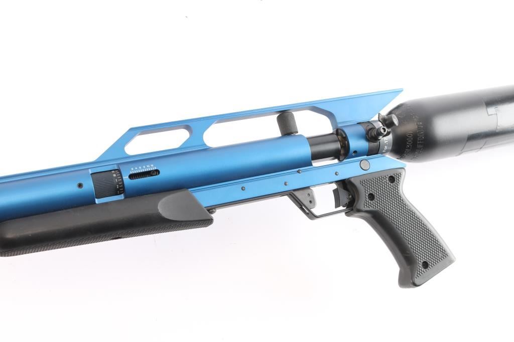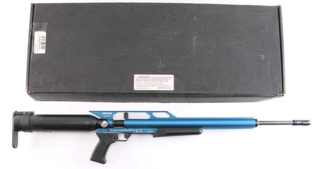 Model R0401. AirForce Condor PCP Air Rifle, Spin-Loc,, blue finish, 22" threaded barrel with 4 prong muzzle break installed,105ft. lbs. of energy in .177 caliber, high velocity pneumatic system is recoilless, match grade precision barrel, light weight (6.5 lbs) .Comes with a Spin-Loc tank system featuring the Ring-Loc Valve system, and an integral extended scope rail. Tank system features a pressure gauge and refill nipple, manual safety in triggerguard, 2 stage adjustable trigger, buut plate installed on tank, checkered black rubber grip & forearm. Excellent, like new condition. Comes in factory box with matching label with manual, CD, buttplate, scope rail, wire stock and scope rings.