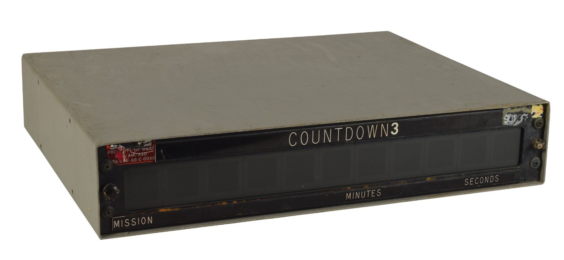 United States Air Force countdown clock, measuring 19 x 3.75 x 14.75, with an affixed red label on the front, reading, "Property of USAF PAN/AM/ASD 08(606)-68-C-0040." The digital readout is headed "Countdown 3," with labels along the bottom for "Mission," "Minutes," and "Seconds." There are three pin-type connectors on the rear that would connect to communication cables. In very good to fine condition. This clock would have been associated with various launch operations, primarily to place military payloads into space.