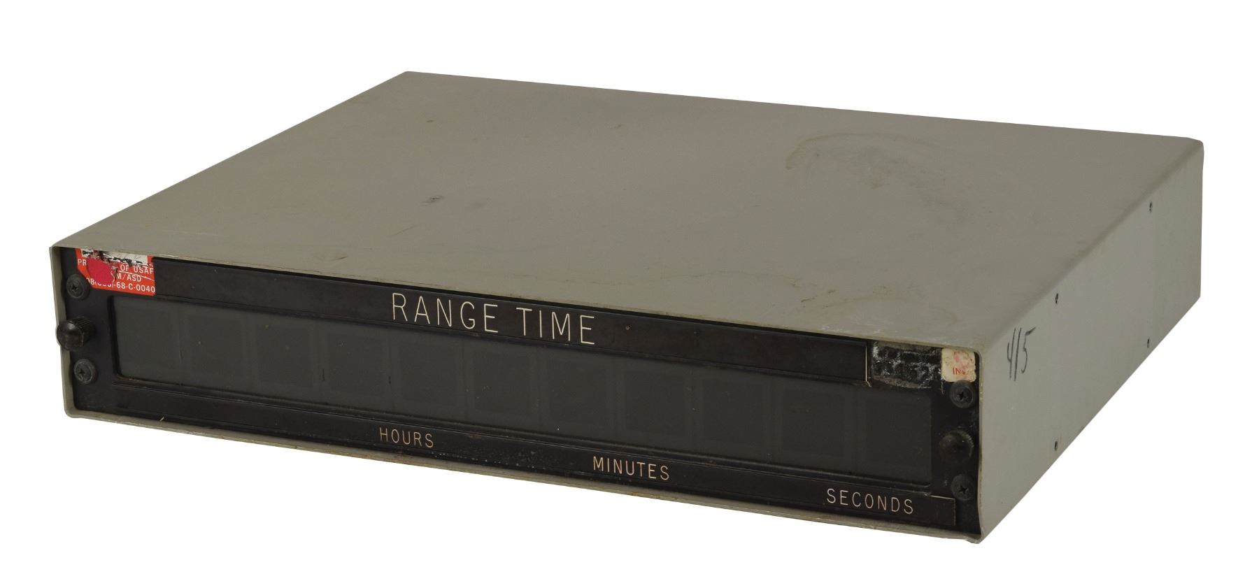 United States Air Force clock, measuring 19 x 3.75 x 14.75, with an affixed red label on the front, reading, "Property of USAF PAN/AM/ASD 08(606)-68-C-0040." The digital readout is headed "Range Time," with labels along the bottom for "Hours," "Minutes," and "Seconds." There are three pin-type connectors on the rear that would connect to communication cables. In very good to fine condition.