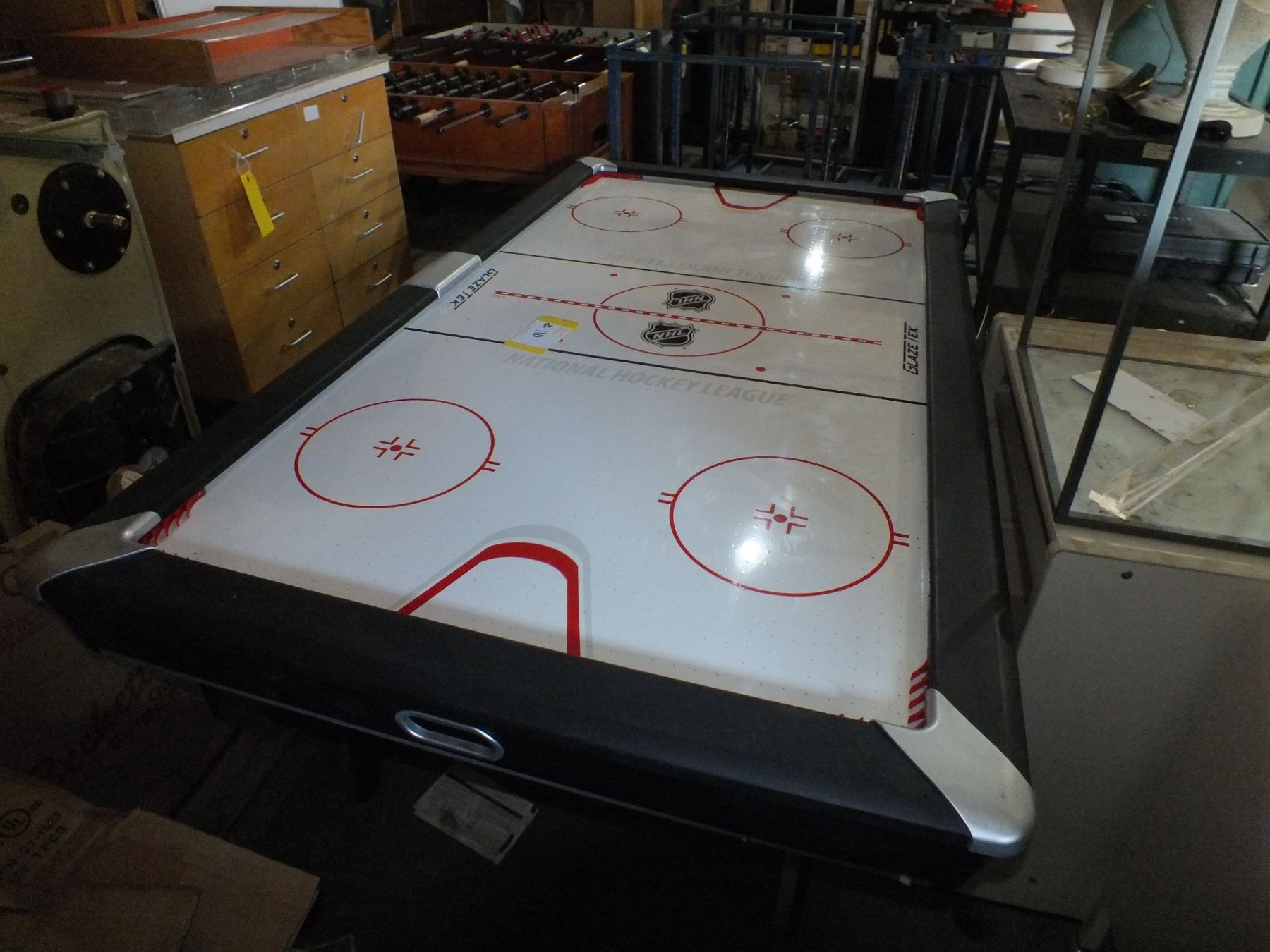Air Hockey Table, one of the legs has been repaired and was home made, score clock runs on batteries and the table is in good working condition and in great shape, no paddles or puck....used