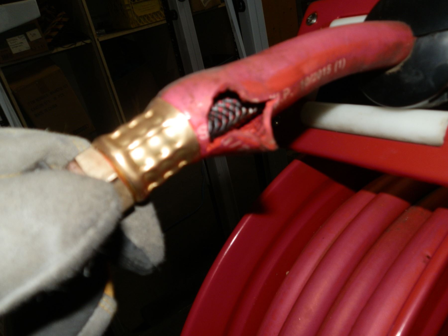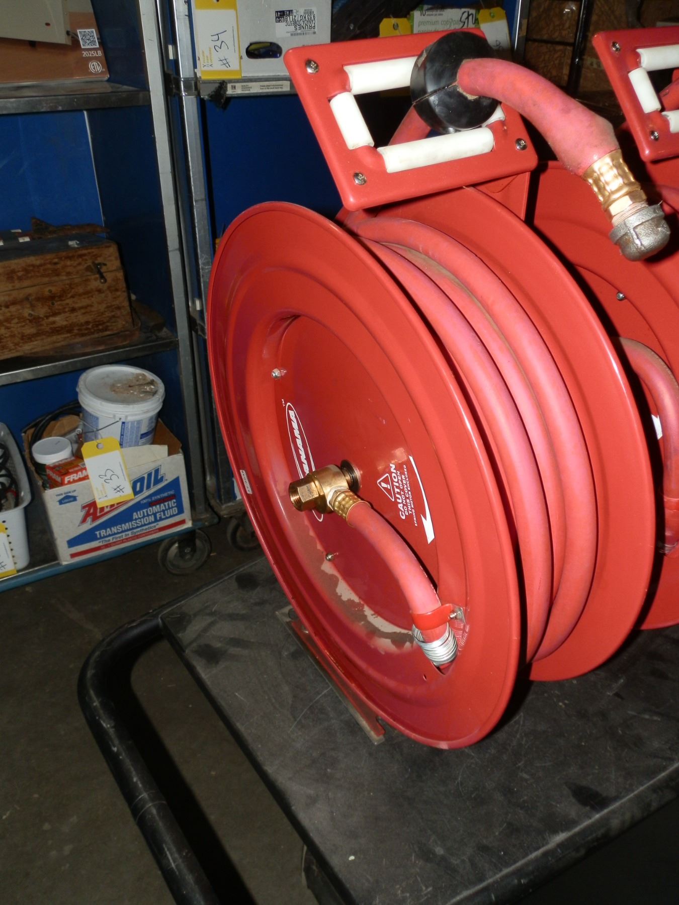 Air Hose Reel with hose, some damage on the hose as seen in the photos, looks just like the outer sleeve is damaged....used