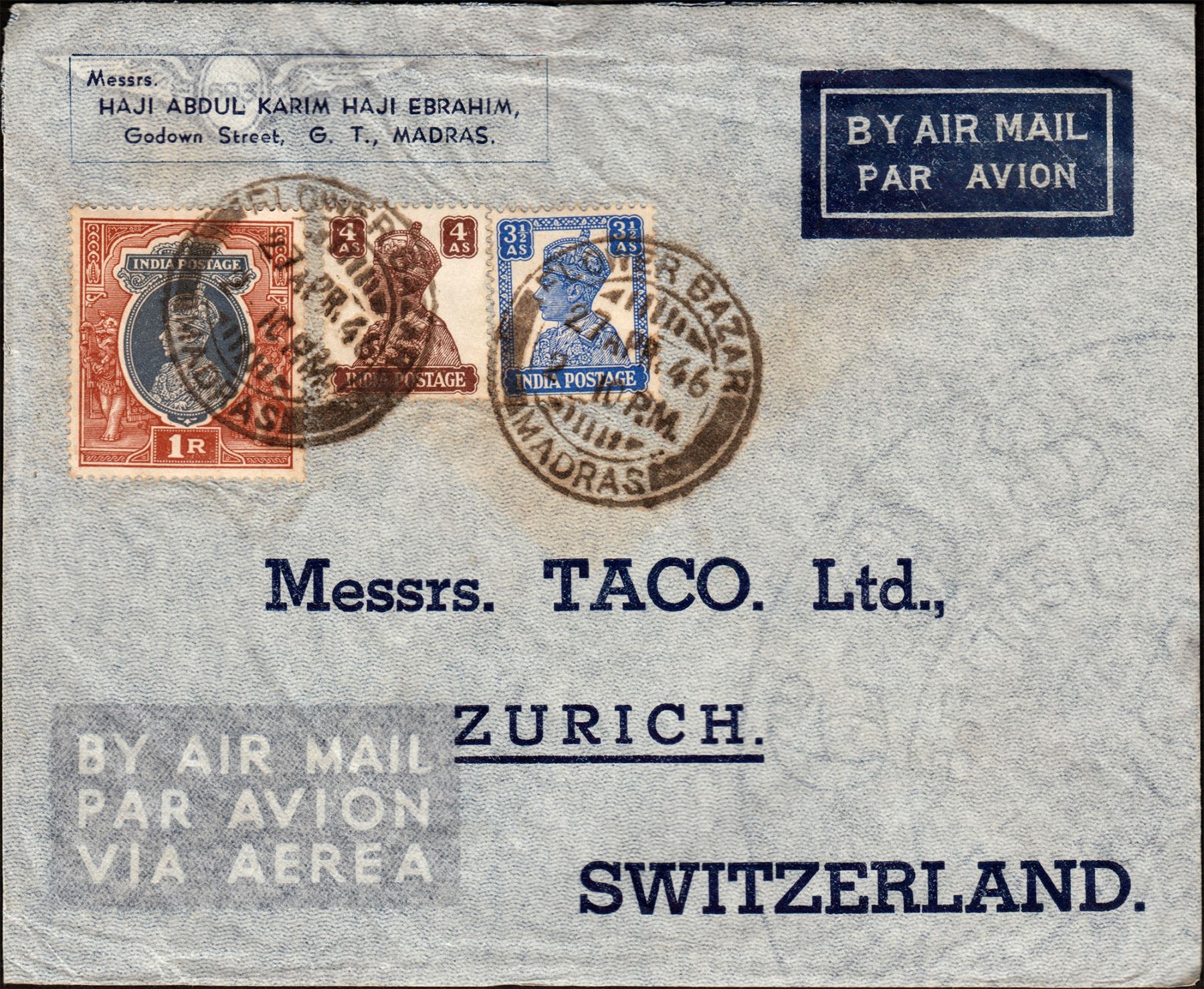 Air Mail Cover, 1946, Madras to Zurich, King George VI period, Dated 27 April 1946, tied with 3 Stamps of King George VI of values 1Re, 4As. & 3½As. affixed, the total value of 1Re & 7½ Annas, with the cancellation of “FLOWER BAZAR | MADRAS”, addressed to Switzerland, sent from Madras, excellent condition.