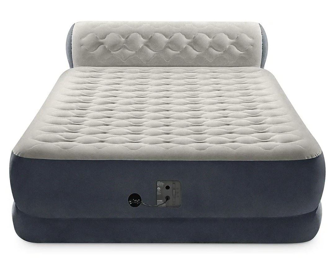 Inflatable queen bed with comfort quilt top, headrest, and integrated electric pump for quick inflation, navy and grey, new.