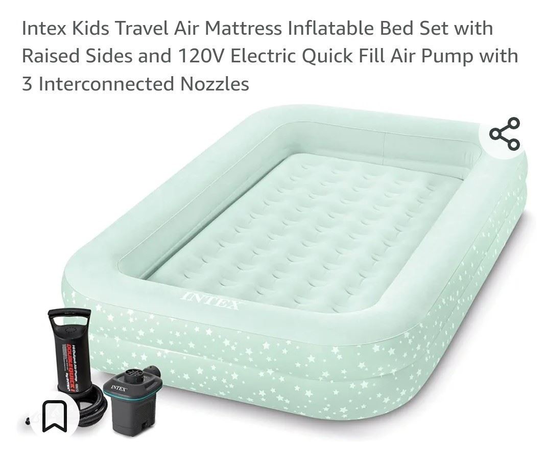 Child-friendly inflatable bed with secure raised sides, includes 120V quick-fill electric air pump, new.