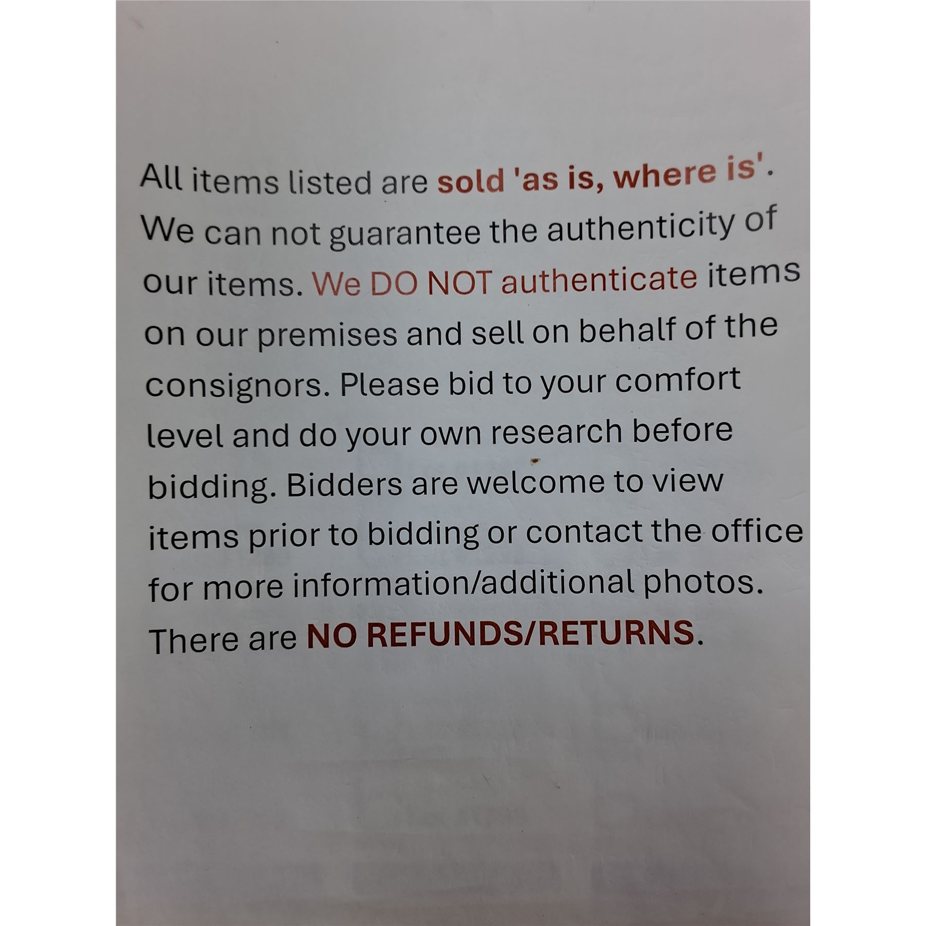 If you are wanting to hold on items for another auction coming up, let us know within 24 hours (maximum hold: 2 auctions). Please give 15 to 30 days for items to be collected, packed, payment processed and shipped out.