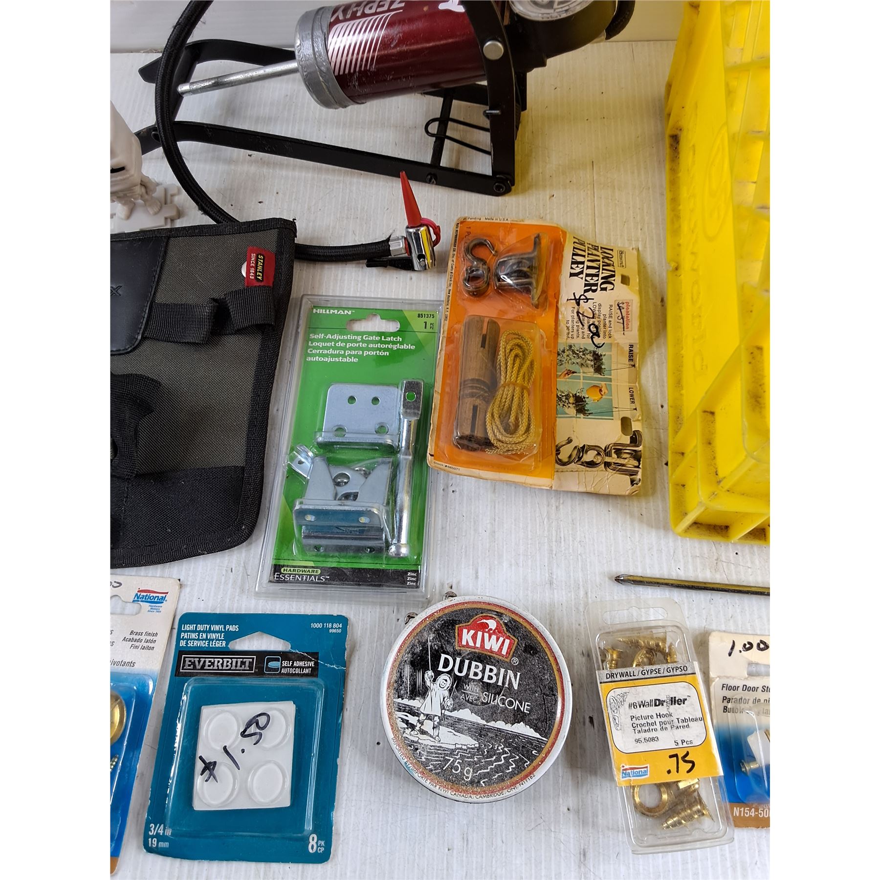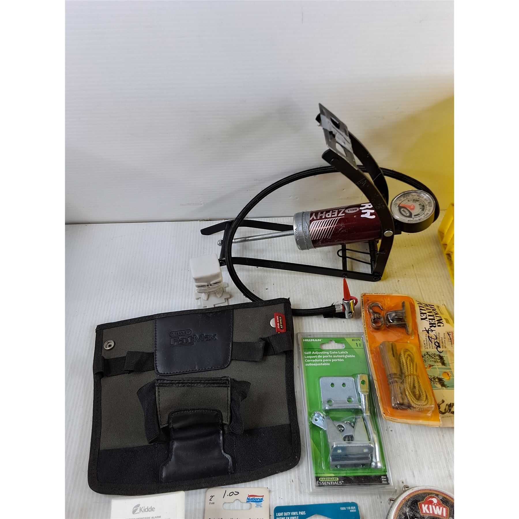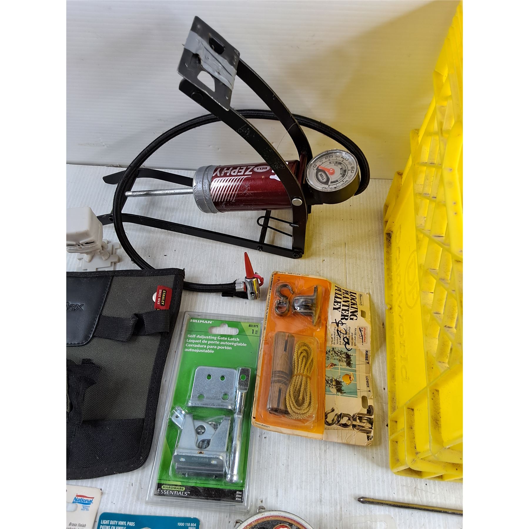Air Pump, Stanley FatMax, Milk Crate, Picture Hangers, Gate Latch, Mirror Holders, Misc