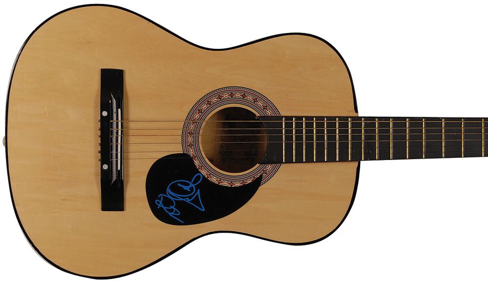 Natural wood-finish six-string acoustic guitar, signed on the black pickguard in blue ink by Graham Russell and Russell Hitchcock. In fine condition. Oversized.