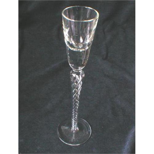 Six unique Air Twist deceptive drams with a trumpet bowl. These are 8.5" tall. Probably used as toasting glasses.