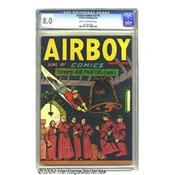<B>Airboy Comics V3#5 (Hillman, Fall 1946) CGC VF 8.0 Cream to off-white pages.</B></I> Fred Kida cover and art. Monks of Capistrano appearance. Overstreet 2004 VF 8.0 value = $182. <BR><BR><B>Important notice:</B> Heritage usually auctions material at the rate of 200-250 lots per hour. On some occasions eBay Live bid software or the Internet may not be able to keep up with the pace of the auction. We recommend placing a realistic absentee bid now as insurance to avoid disappointment. Occasionally the auctioneer may eliminate or reject an eBay Live bid, and the auctioneer may also reopen a lot after the close of the eBay live bidding (usually because we missed an audience bid), and may reject your bid even if it shows you as the winning bidder. By bidding via eBay Live, you agree that Heritage may award the lot to another bidder at its sole discretion under the circumstances described above or any other reasonable circumstances. Since eBay bids are not shown to us until we open the lot on the floor, we treat those bids just like floor bids. In most cases the floor responds before the eBay bid is presented to us, due to Internet lag time, so for consistency we have made it a policy that floor bids are always considered first over tie eBay live bids. Also please note that all Heritage lots purchased through eBay Live carry a 20% Buyer's Premium. Please make sure you read the Terms and Conditions before you bid. </span></font></tr></table></td></tr></table>