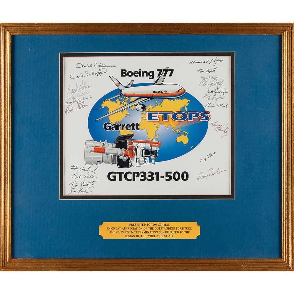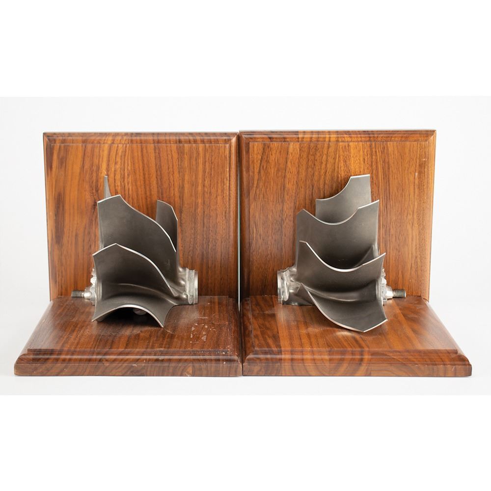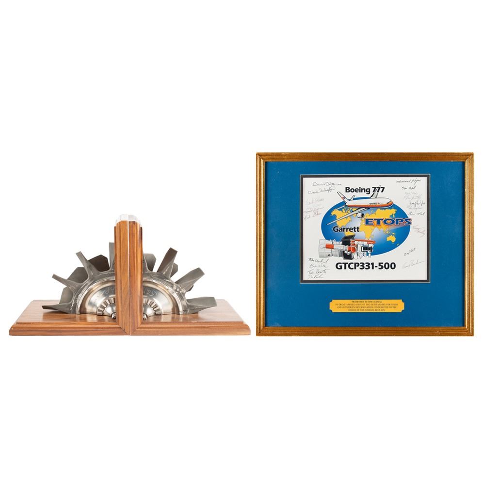 Fine pair of wooden bookends with mounted aircraft engine turbine sections, each measuring approximately 7Àù x 7Àù x 7Àù, with the radius of the turbine segment being about 4.5Àù. Also include a color 10.75 x 8.5 print honoring the GTCP331-500 APU used in the Boeing 777, signed by various members of the team, double-matted and framed to an overall size of 19 x 15, with engraved presentation plaque reading: "Presented to Tom Schmal, in great appreciation of the outstanding fortitude and outspoken determination contributed to the design of the world's best APU." In overall fine condition.