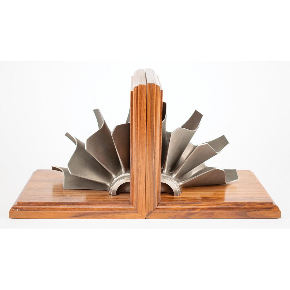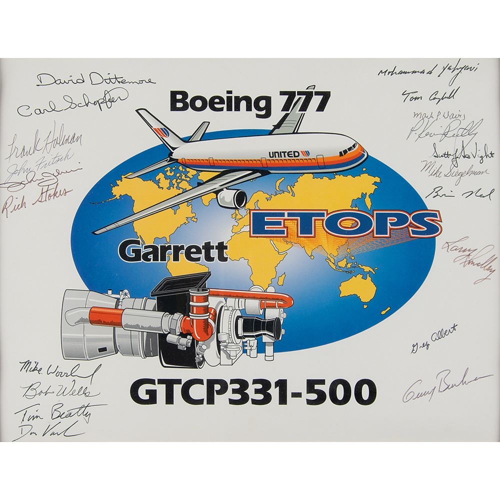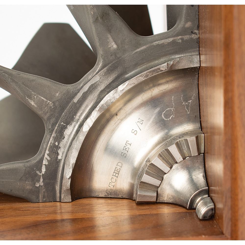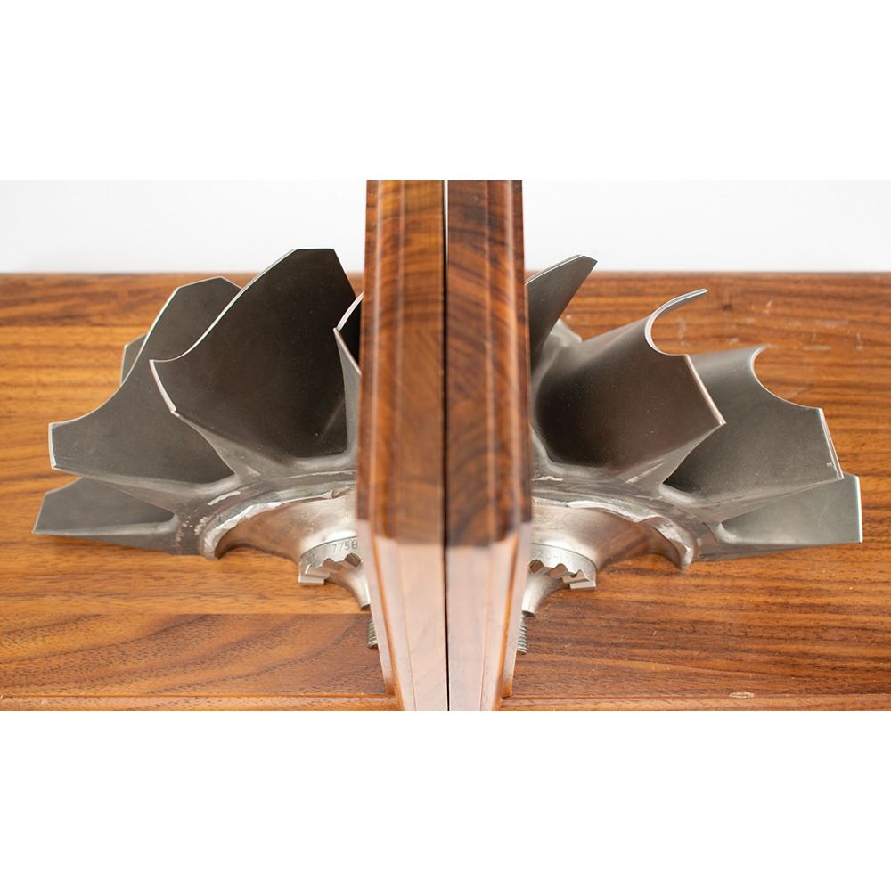 Fine pair of wooden bookends with mounted aircraft engine turbine sections, each measuring approximately 7Àù x 7Àù x 7Àù, with the radius of the turbine segment being about 4.5Àù. Also include a color 10.75 x 8.5 print honoring the GTCP331-500 APU used in the Boeing 777, signed by various members of the team, double-matted and framed to an overall size of 19 x 15, with engraved presentation plaque reading: "Presented to Tom Schmal, in great appreciation of the outstanding fortitude and outspoken determination contributed to the design of the world's best APU." In overall fine condition.