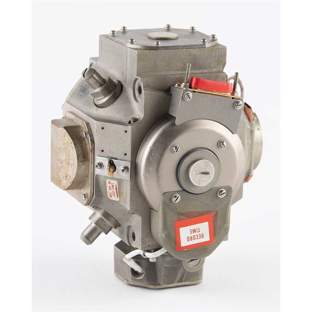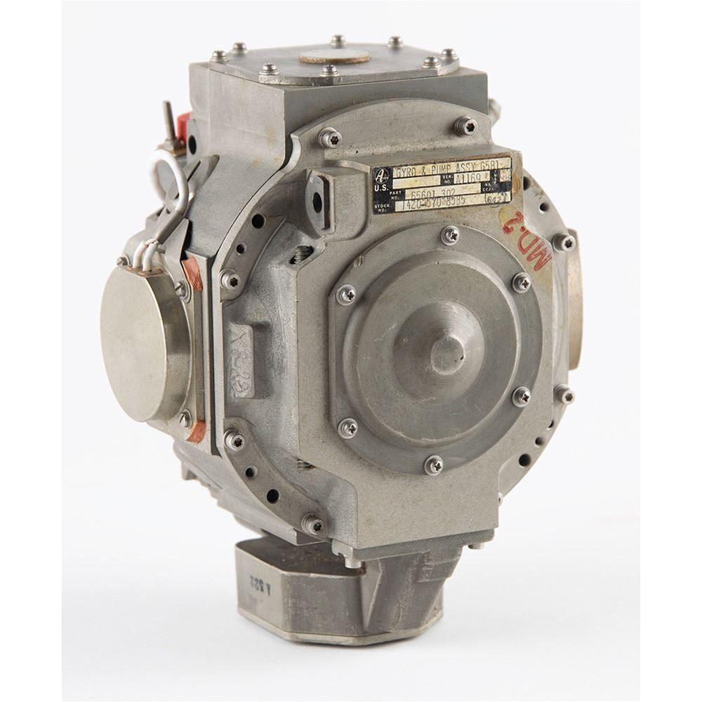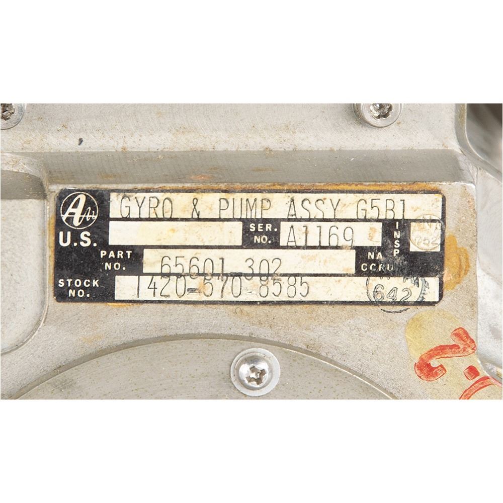 Gyroscope/pump assembly for an undetermined aircraft application, measuring approximately 6.5" x 4.5" x 5.5", with an affixed manufacturer's label: "Gyro & Pump Assy G5B1, Ser. No. A1169, Part No. 65601 302." In fine condition.