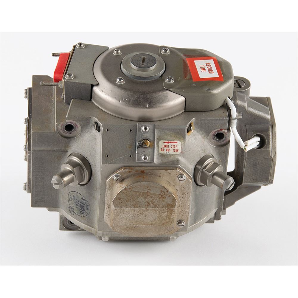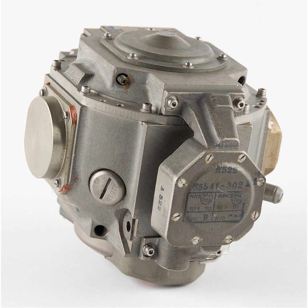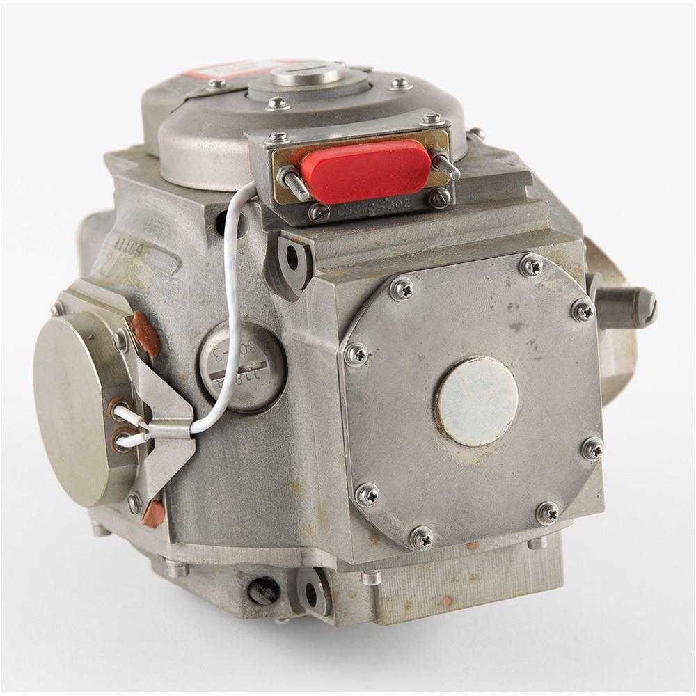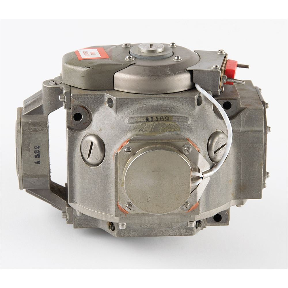 Gyroscope/pump assembly for an undetermined aircraft application, measuring approximately 6.5" x 4.5" x 5.5", with an affixed manufacturer's label: "Gyro & Pump Assy G5B1, Ser. No. A1169, Part No. 65601 302." In fine condition.