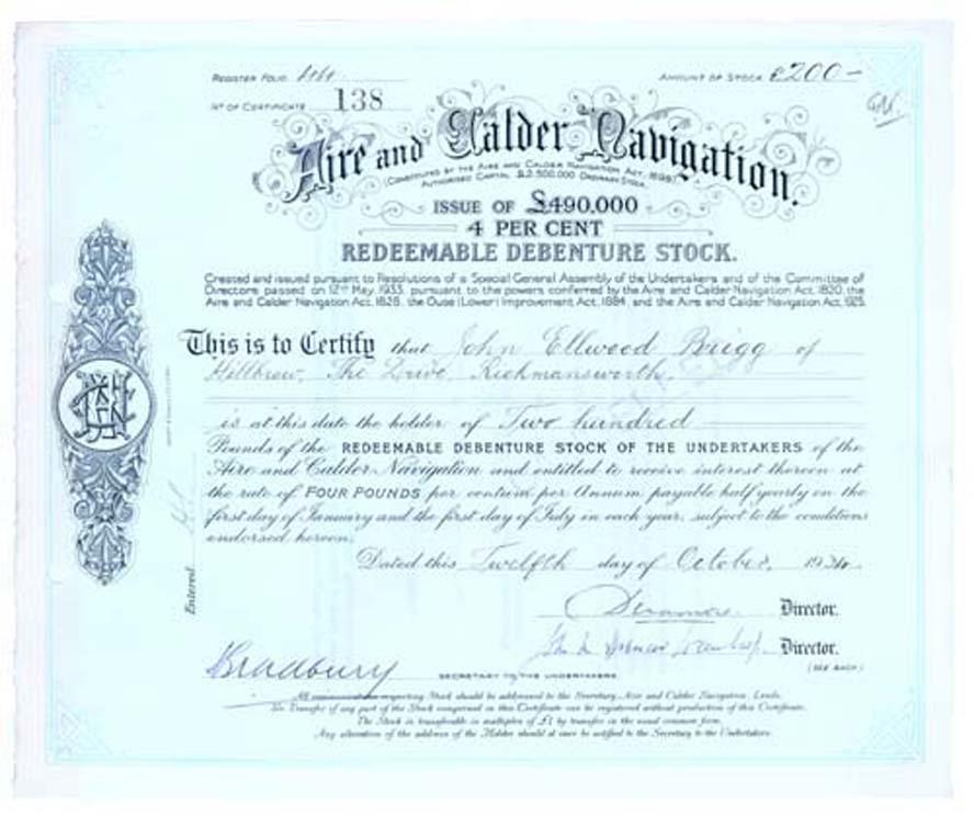 1934, England. 4% Redeemable Debenture Stock. Blue\Brown. Stock certificate for 100 Pounds. Ornate Design at Left. The Aire and Calder Navigation Company has a rich history dating back to as early as 1699 when Parliament passed an act to improve the navigability of the River Aire. Since its inception, the canal has been continuously improved and expanded and today is still in existence. Some light glue residue at left margin. Very Fine.