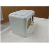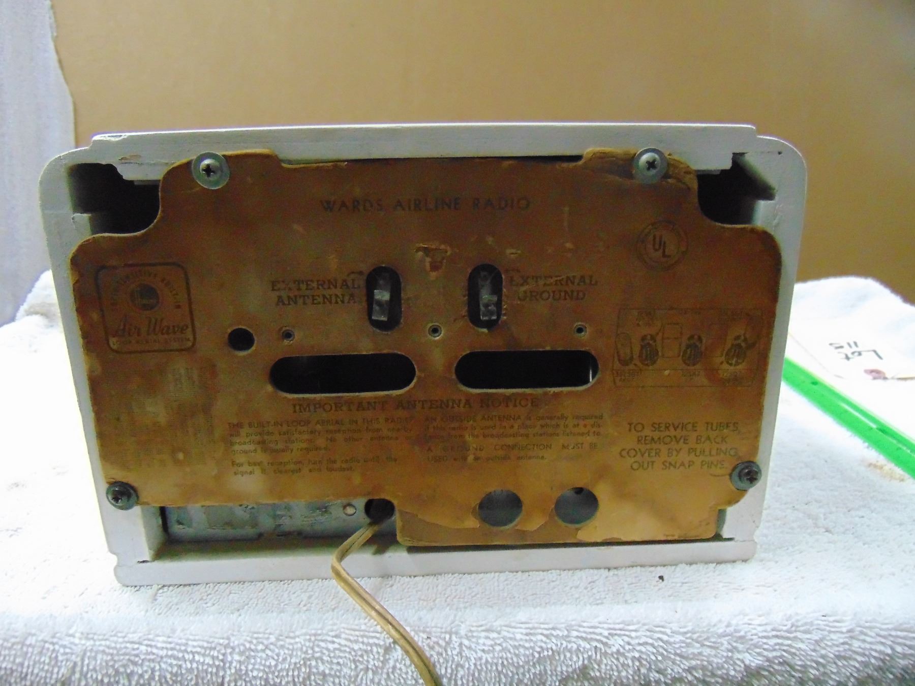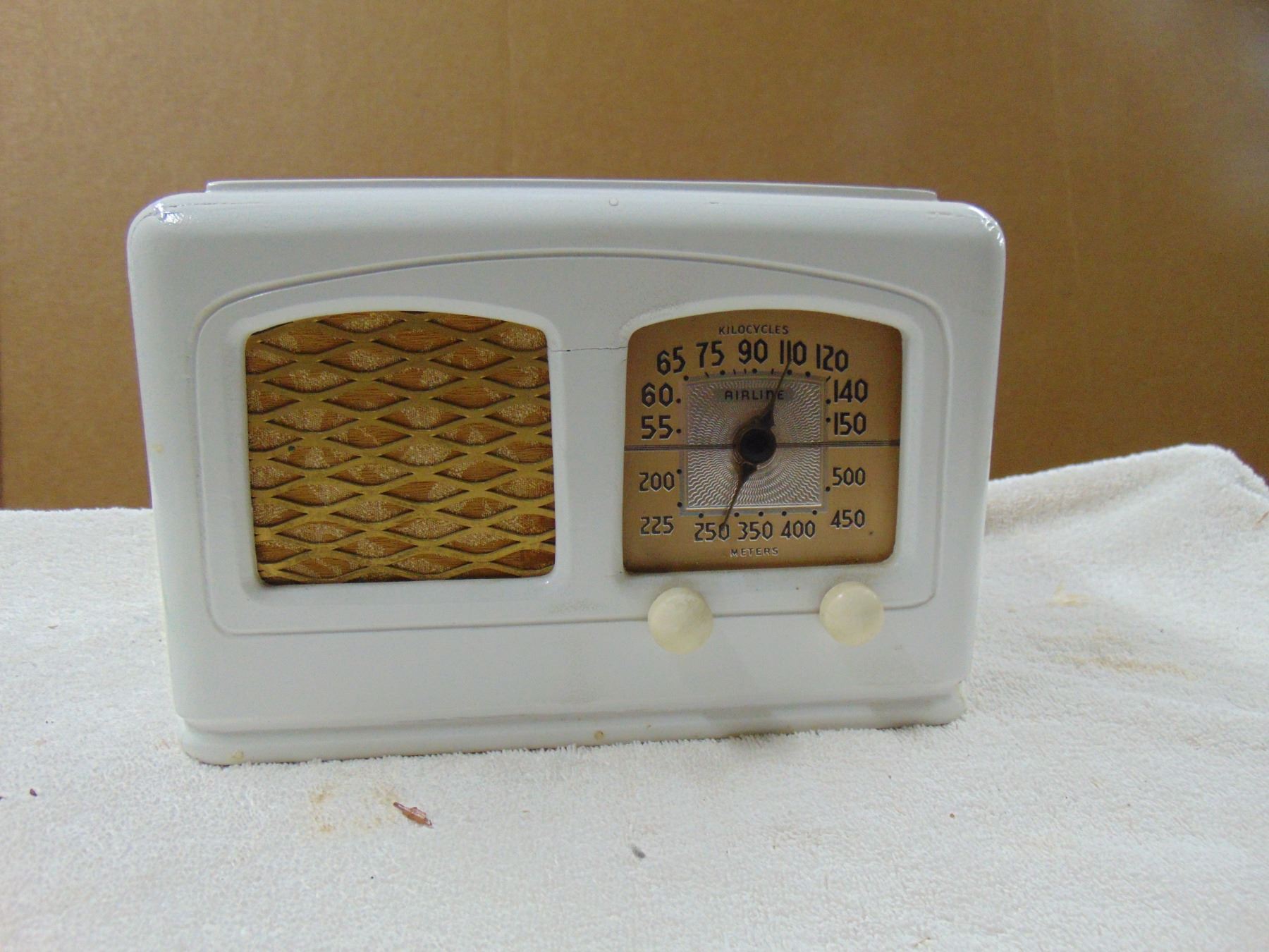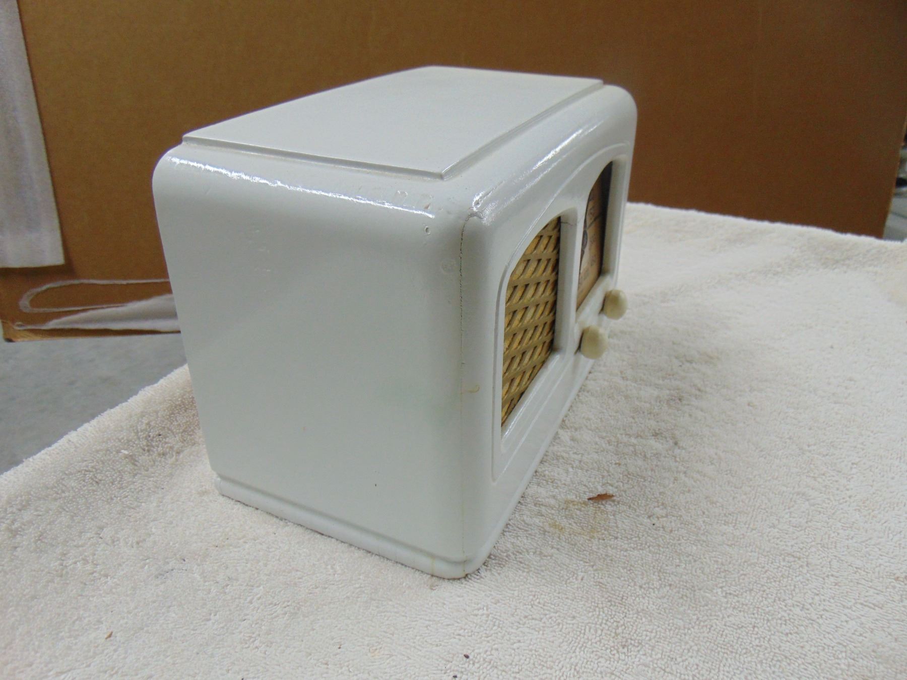 Wood table set; original back; cabinet has been painted white; missing dial cover; works
