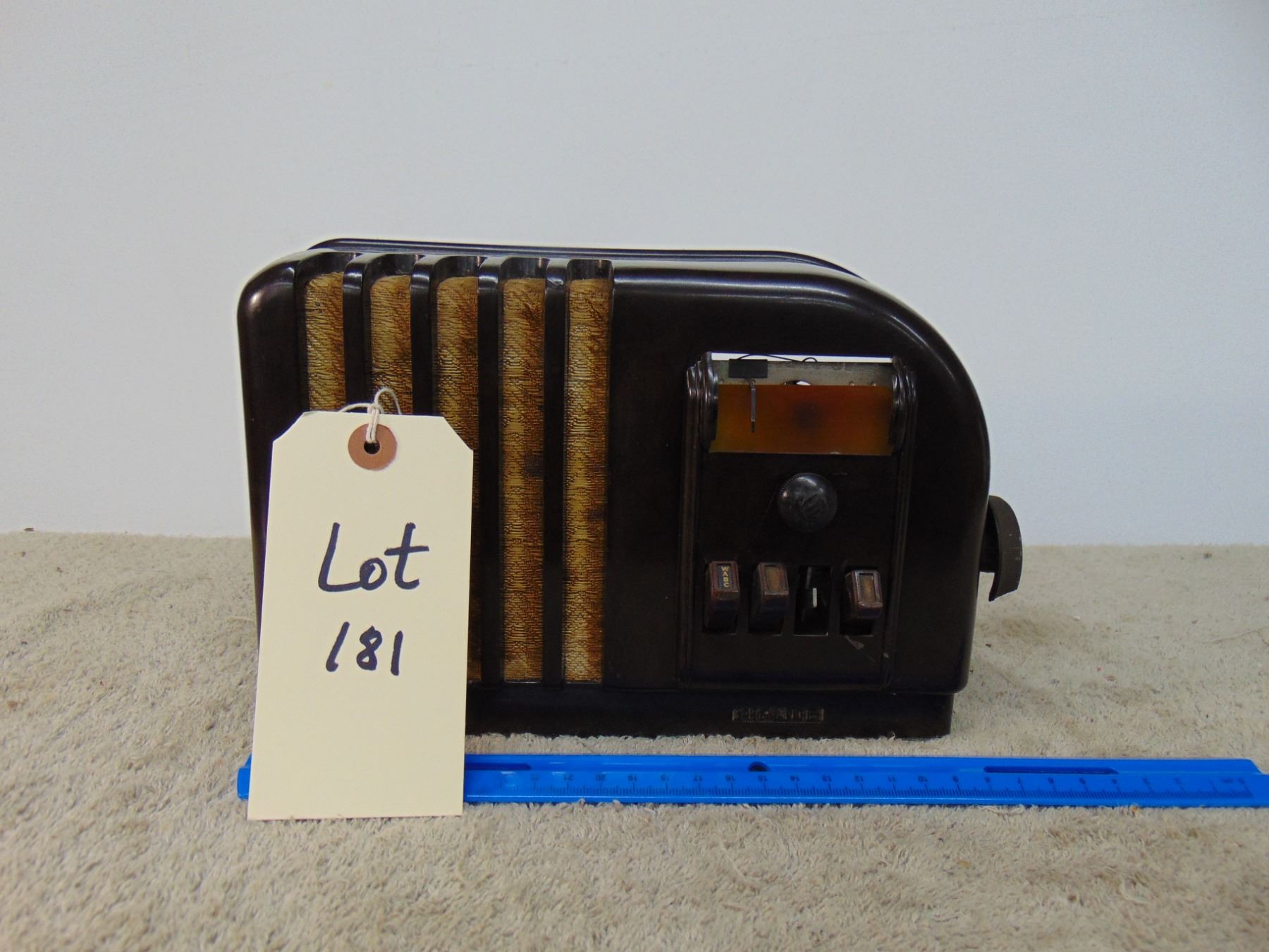 Brown bakelite table set; model 04BR-508A; classic radio with some cabinet damage