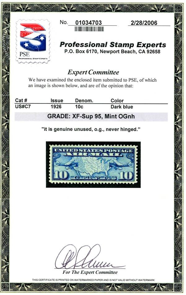 Airmail, 1926, 10¢ Map & Planes. Scott C7. SMQ $100, XF-SUP, with 2006 P.S.E. certificate graded XF-SUP 95