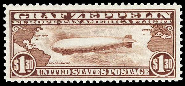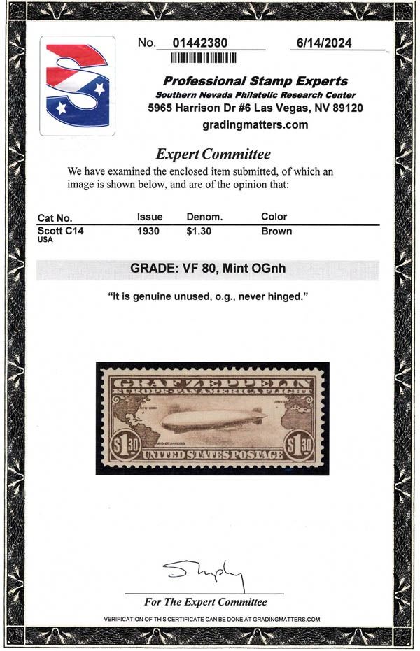 Airmail, 1930, $1.30 Graf Zeppelin. Scott C14. SMQ $550, VF, with 2024 P.S.E. certificate graded VF 80 and 2006 A.P.S. certificate